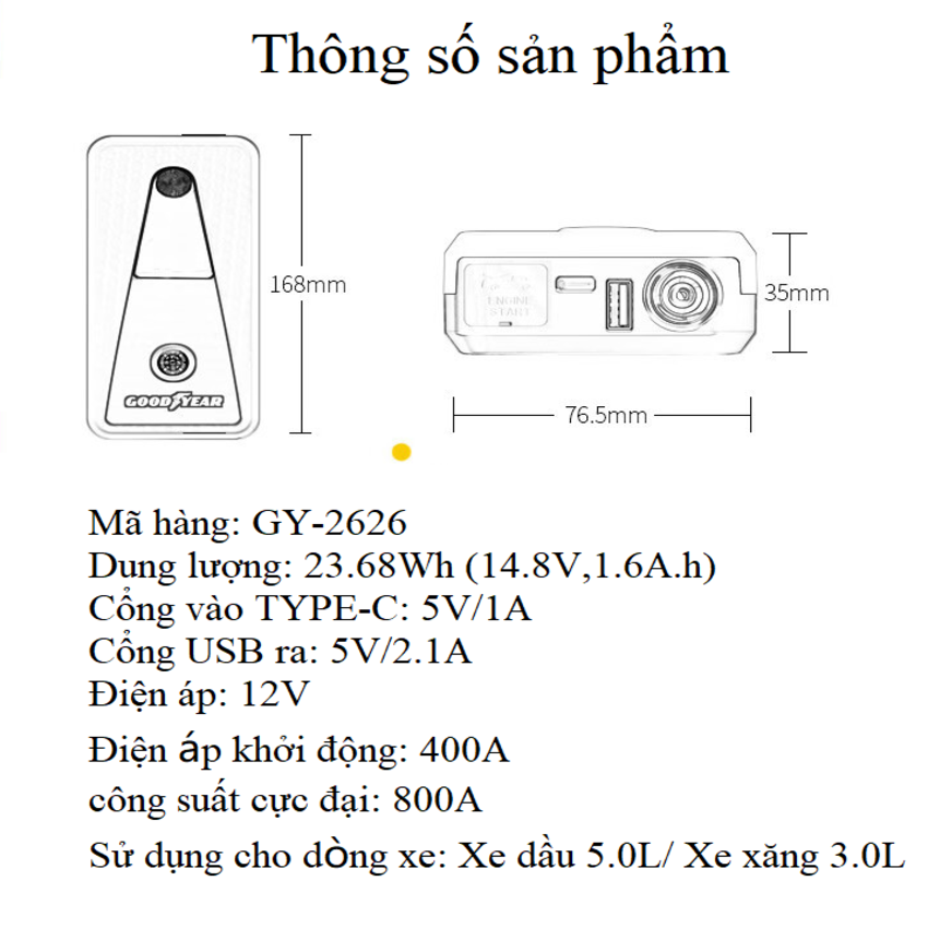 Giới thiệu kích bình acquy kiêm pin sạc dự phòng Goodyear GY-2626