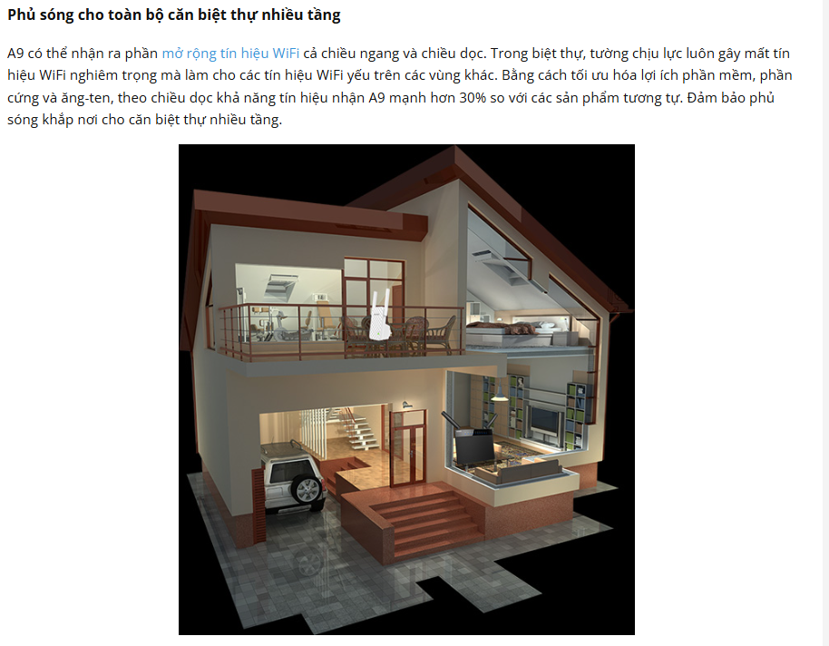 Tenda A9 là sự lựa chọn hoàn hảo để cung cấp tín hiệu mạnh mẽ ở những khu vực sóng yếu nhưng khó khăn trong việc lắp đặt thiết bị Wifi thông thường. Mở rộng vùng