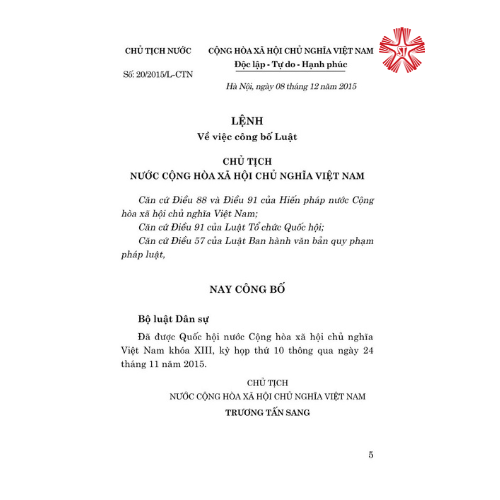 Ngày 24/11/2015, tai kỳ họp thứ 10, Quốc hội khóa XIII đã thông qua BLDS số 91/2015/QH13, có hiệu lực thi hành từ ngày 01/01/2017. Việc ban hành bộ luật lần này nhằm xây dựng