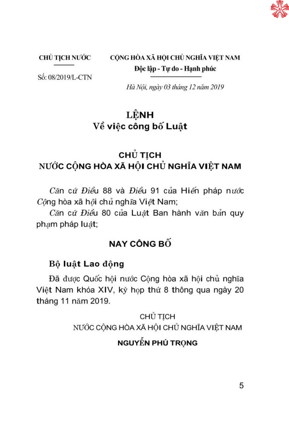 1/Bộ luật Lao động năm 2019 được Quốc hội nước Cộng hòa xã hội chủ nghĩa Việt Nam khóa XIV, kỳ họp thứ 8 thông qua ngày 20 tháng 11 năm 2019. Luật này có