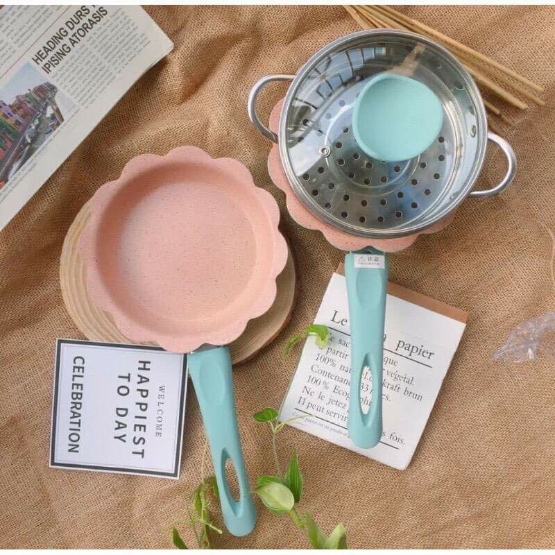 BỘ NỒI CHẢO CHO BÉ ĂN DẶM HÌNH HOA CAO CẤP, THÀNH NỒI 6 LỚP, TRÁNG MEN ĐÁ CHỐNG DÍNH, KÈM XỬNG HẤP