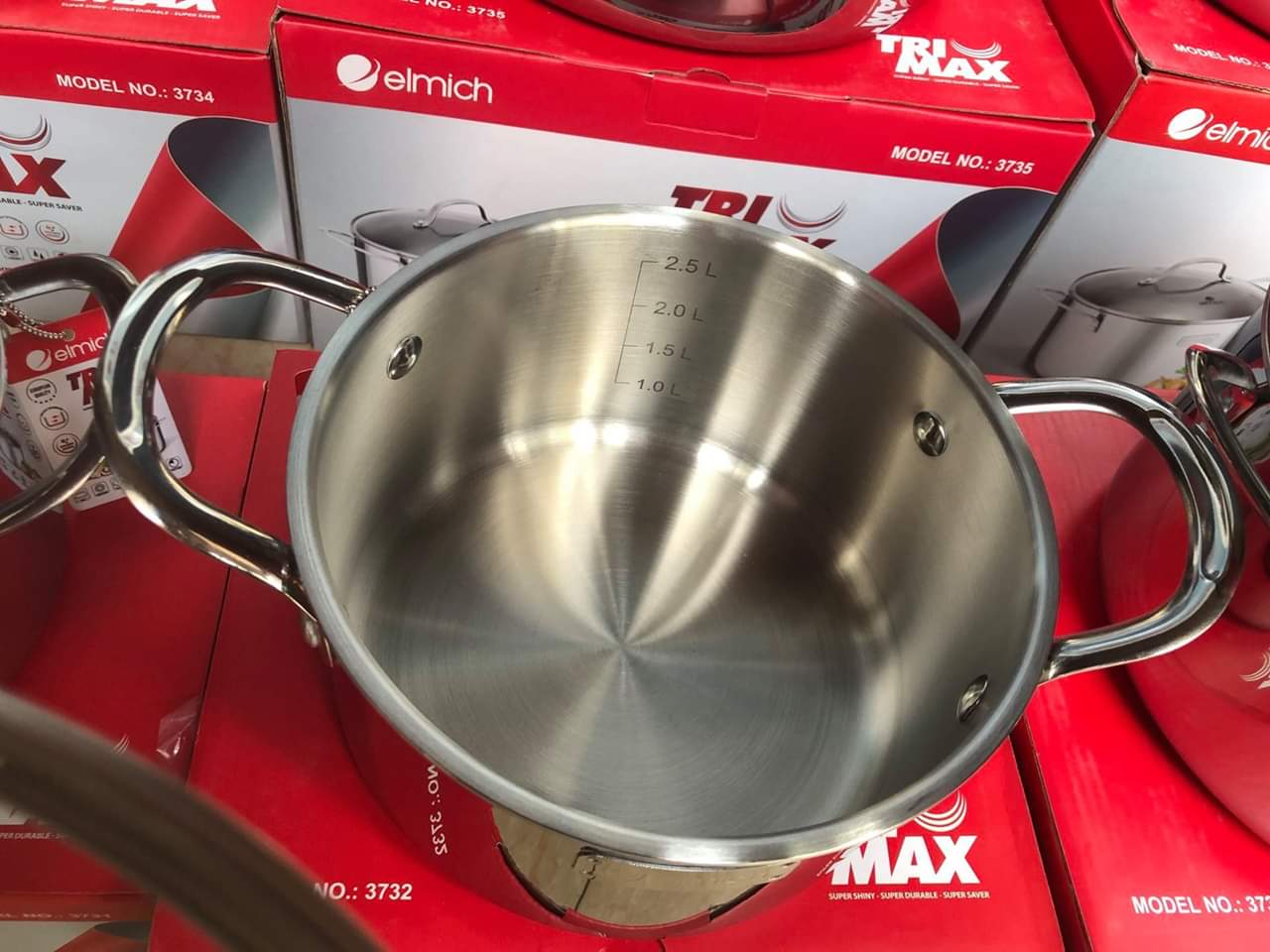 Bộ nồi Inox cao cấp 3 lớp liền đáy Tri- Max EL-3742- 4 chiếc Size 18cm, 20cm, 26cm và Chảo 26cm 3 lớp cả thân đáy liền bắt nhiệt nhanh và tỏa nhiệt đều từ thành và đáy.
