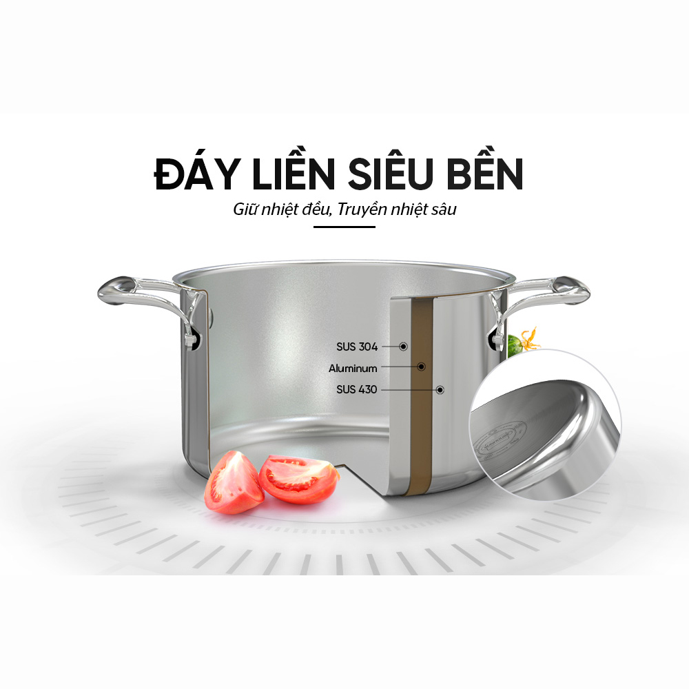 Bộ sản phẩm có cấu tạo đáy liền dày dặn, cứng cáp giúp truyền nhiệt đều, tỏa nhiệt tốt. Thực phẩm trong quá trình nấu nướng được chín đều và giữ được trọn vẹn chất dinh dưỡng. Đặc biệt, sản phẩm giúp tiết kiệm thời gian, nhiên liệu và hạn chế cháy khét thực phẩm.