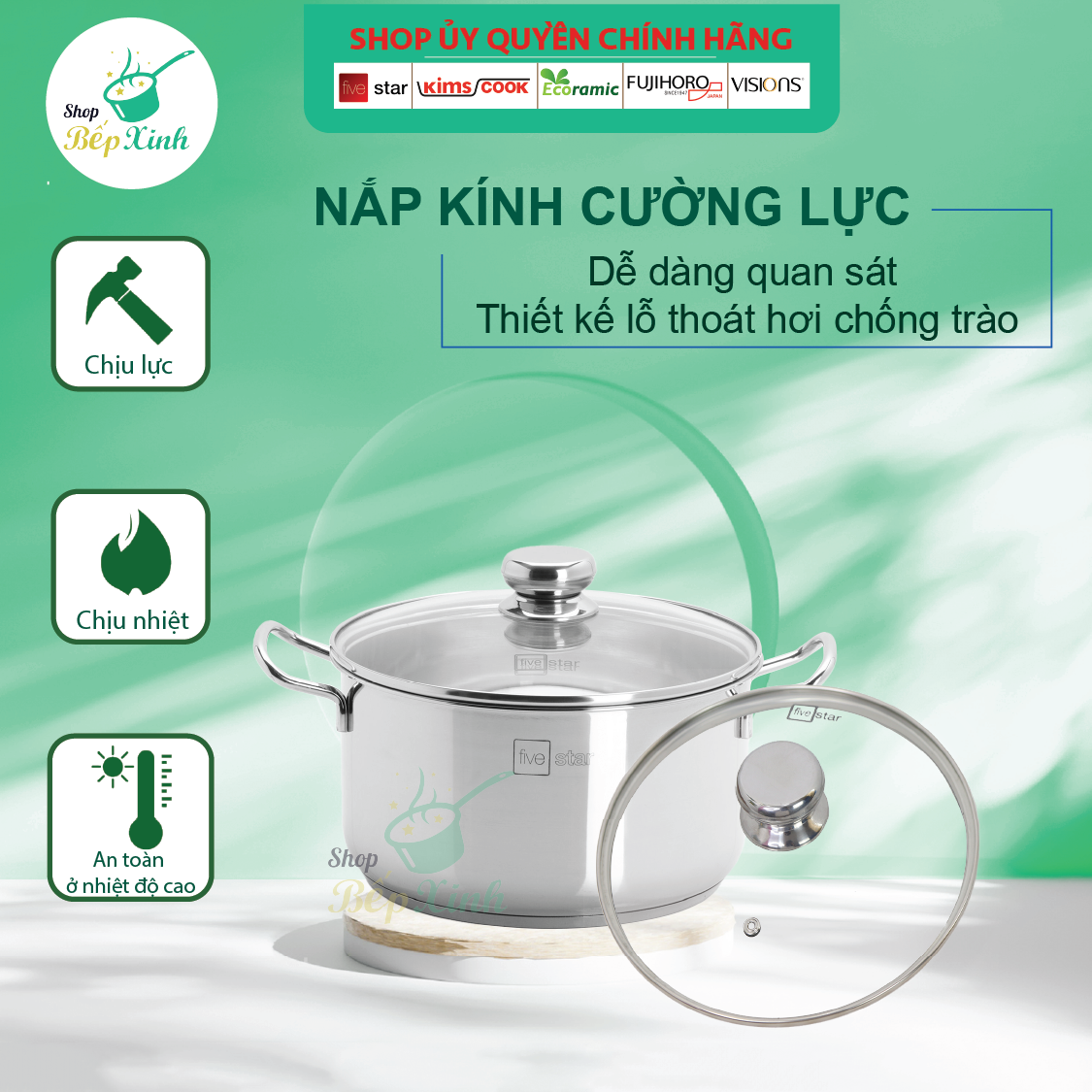 Bộ nồi chảo xửng hấp 3 Đáy Inox 430 cao cấp Fivestar Standard bếp từ nắp kính , tặng 1 vá canh Bộ nồi inox có 9 món gồm : +Quánh có đường kính