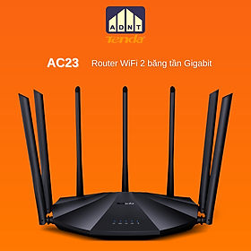-Tenda AC23 là Router WiFi 2 băng tần AC2100 Gigabit, hỗ trợ chuẩn 802.11AC Wave2 với tốc độ WiFi lên đến 2033Mbps giúp bạn trải nghiệm tốc độ tối đa đường truyền Internet.