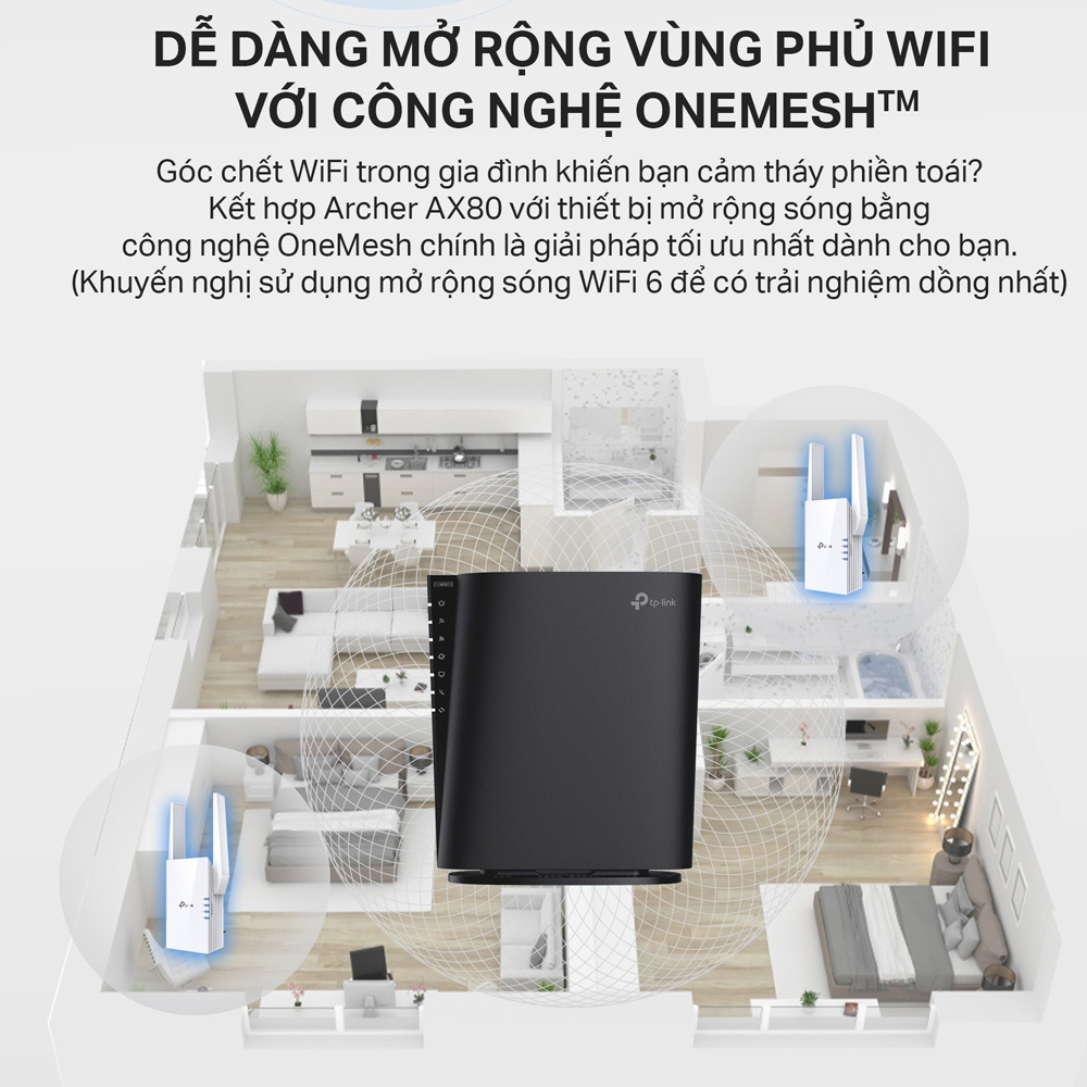 Router 3200Mbps Wi-Fi 6 Dual-band Gigabit Mesh: - Băng thông lớn; CPU lõi kép 4 luồng, hỗ trợ NAT - Truy cập đồng thời 48 người dùng (đề xuất) truy cập Wifi hai dải băng