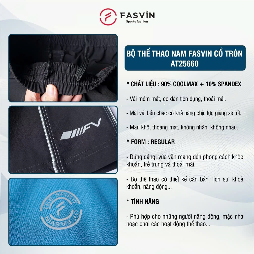=>  Các shop có thương hiệu đều luôn giữ gìn uy tín của mình. Đến với FASVIN bạn cũng sẽ nhận được điều đó.      Trước khi mua bạn nên tham khảo đánh giá và chat với shop để nhận được tư vấn từ người bán.   =>  Bộ Quần Áo Thể Thao Nam FASVIN Cổ Tròn AT25660.HN Vải Coolmax Đẹp, Mềm Mát Hàng Nhà Máy Chất Lượng Cao sản xuất trong nhà máy của FASVIN tại Việt Nam. Với quy trình thu hóa nghiệm ngặt, các sản phẩm đều được làm ra một cách cẩn thận và chắc chắn.    *CHẤT  LIỆU : 90% COOLMAX + 10% SPANDEX   Vải mềm, nhẹ, trơn mát co giãn tốt.    Mặt vải bền chắc có khả năng chịu lực giằng xé tốt. Khả năng thấm hút mồ hôi tốt, hút ẩm, khô nhanh. => LƯU Ý : Tuỳ từng cây vải khác màu mà chất vải cũng có sự khác biệt. Hãy nhắn tin cho shop để được tư vấn nhé.   *  TÍNH NĂNG NỔI BẬT: