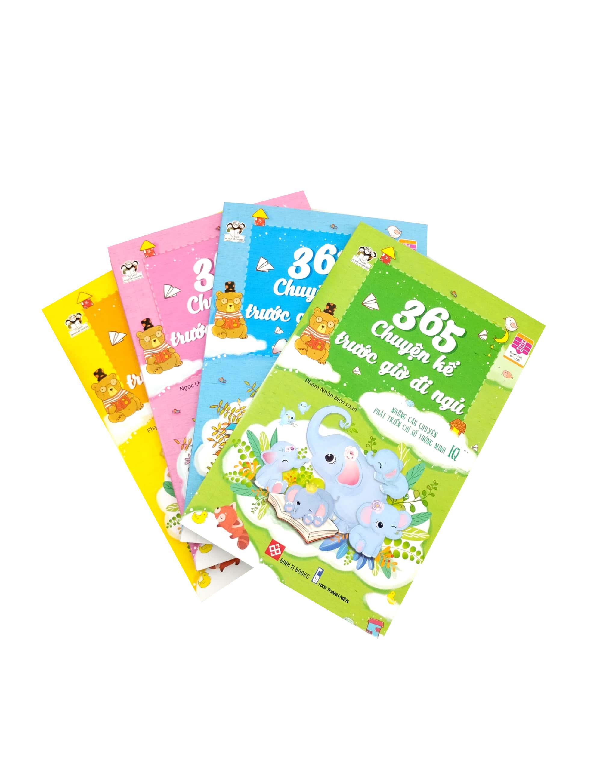 Bộ sách 365 chuyện kể trước giờ đi ngủ gồm bốn tập: Những câu chuyện phát triển chỉ số thông minh IQ (2 tập) và Những câu chuyện phát triển chỉ số tình cảm EQ (2 tập).