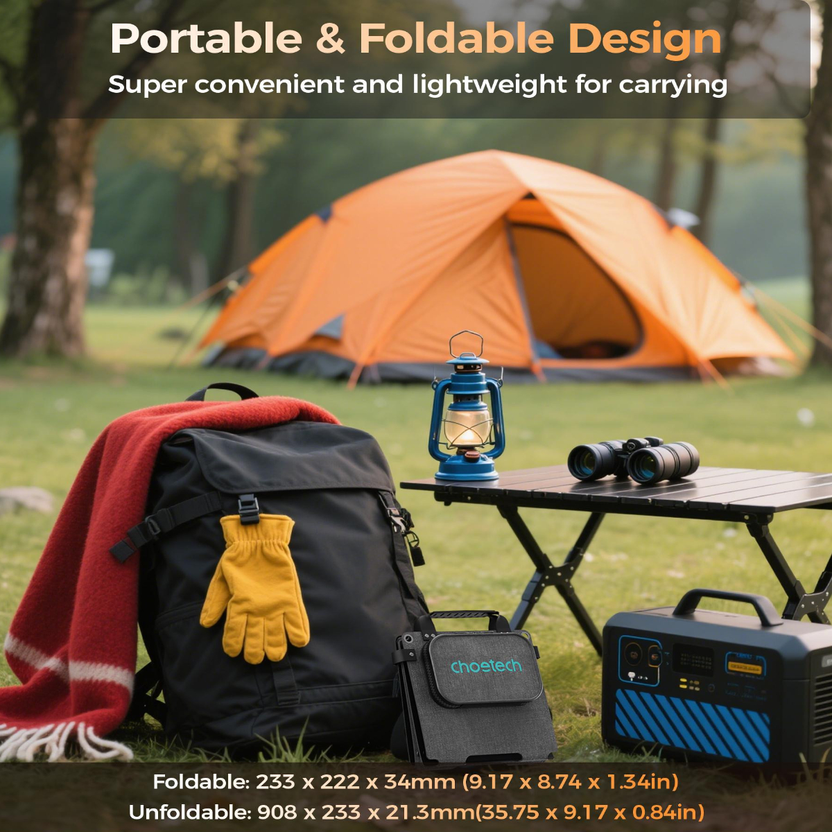 – Choetech SC005-V5 sở hữu thiết kế thông minh với khả năng gấp gọn tiện lợi, dễ dàng bỏ vào balo, túi xách hay treo lên balo trong những chuyến đi dài. Chất liệu bền bỉ, chống chịu tốt với thời tiết, giúp bạn yên tâm sử dụng ngoài trời.