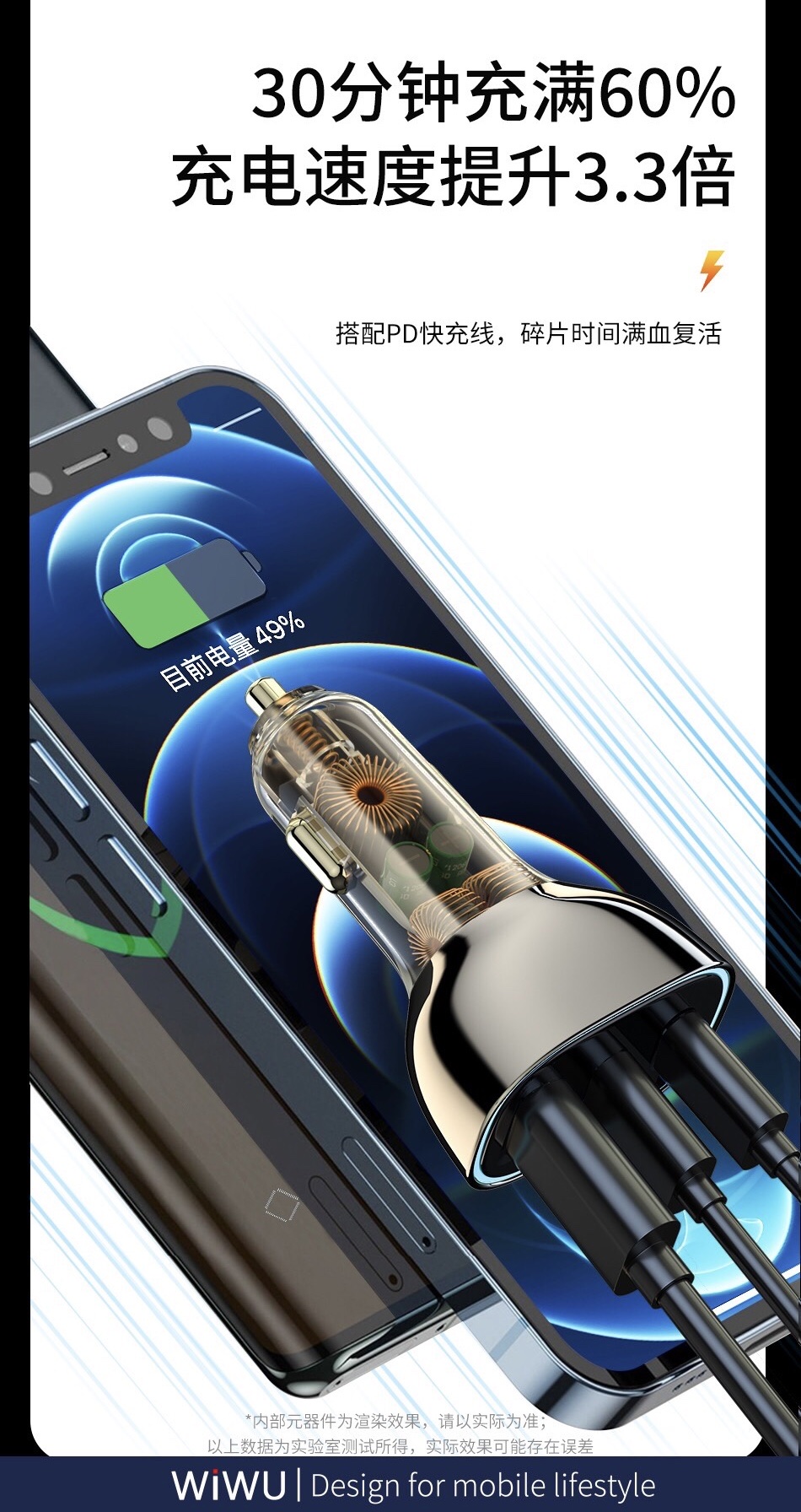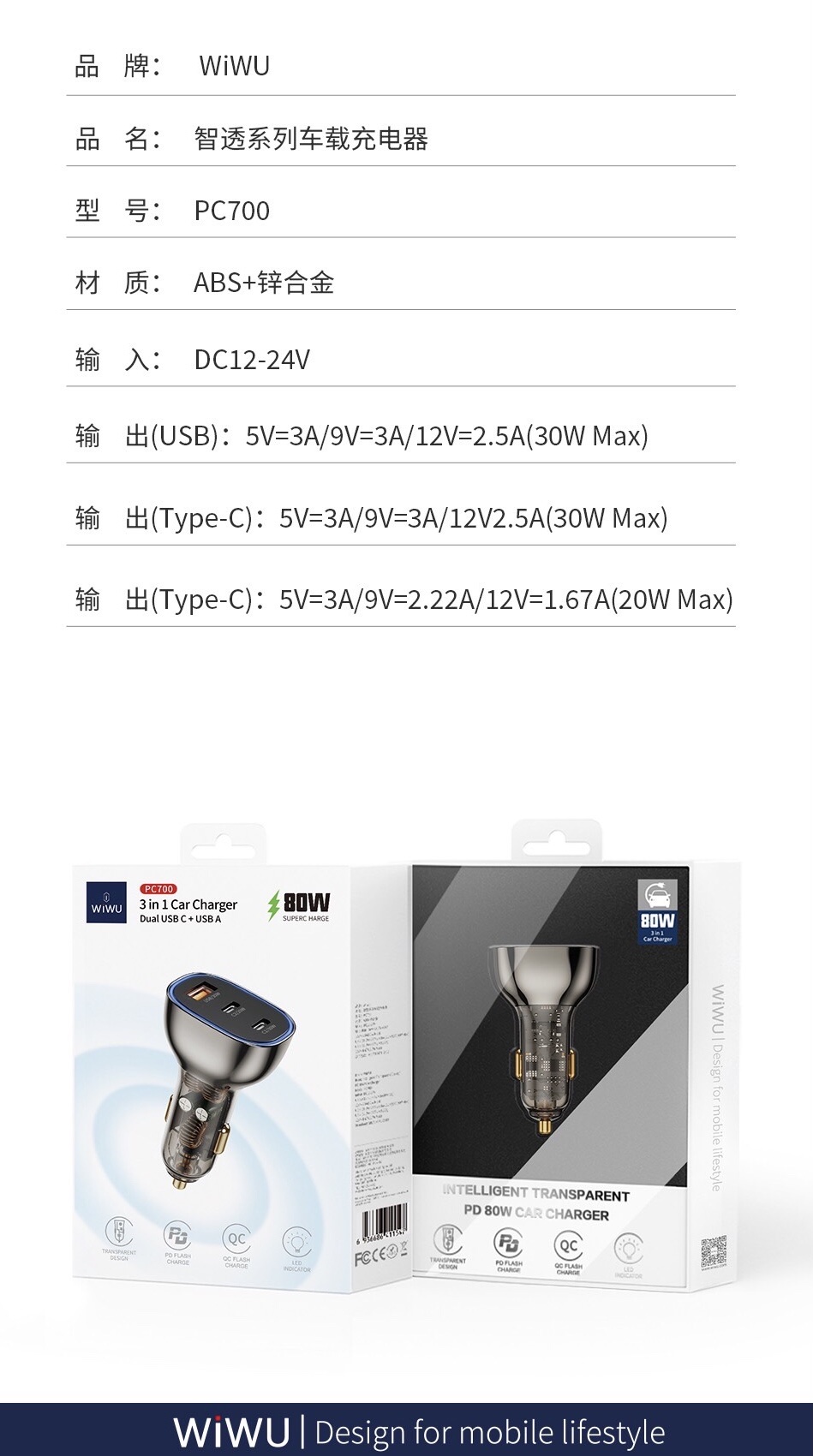 ✨Bộ sạc xe hơi Wiwu 3 In 1 Car Charger Dual USB C + USB A PC700 cho điện thoại sạc nhanh, hỗ trợ sạc 3 cổng một lúc, thiết kế trong suốt - Hàng chính hãng