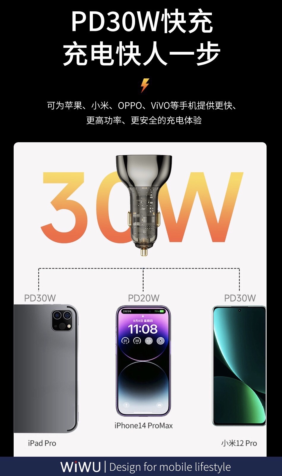 Bộ sạc xe hơi Wiwu 3 In 1 Car Charger Dual USB C + USB A Thương hiệu: Chất liệu: ABS + hợp kim kẽm Đầu vào: DC12-24V Đầu ra (USB): 5V 3A/9V-3A/12V-25A ( Tối đa 30W) Đầu ra ( loại C): SV-3A/9V-3A/12V2.5A (Tối đa 30W) Đầu ra (loại C): SV-3A/V-2.22A/12V 1.67A/Tối đa 20W Sạc nhanh PD30W, cung cấp tốc độ nhanh hơn cho , , các điện thoại di động khác Công suất cao hơn, sạc an toàn hơn Sạc 60% trong 30 phút, tốc độ sạc tăng 3,3 lần Sử dụng công nghệ Shunt điều khiển thông minh, hỗ trợ 3 cổng cùng lúc Thiết kế trong suốt và các thành phần được sắp xếp chính xác Không sợ va đập, cung cấp điện liên tục