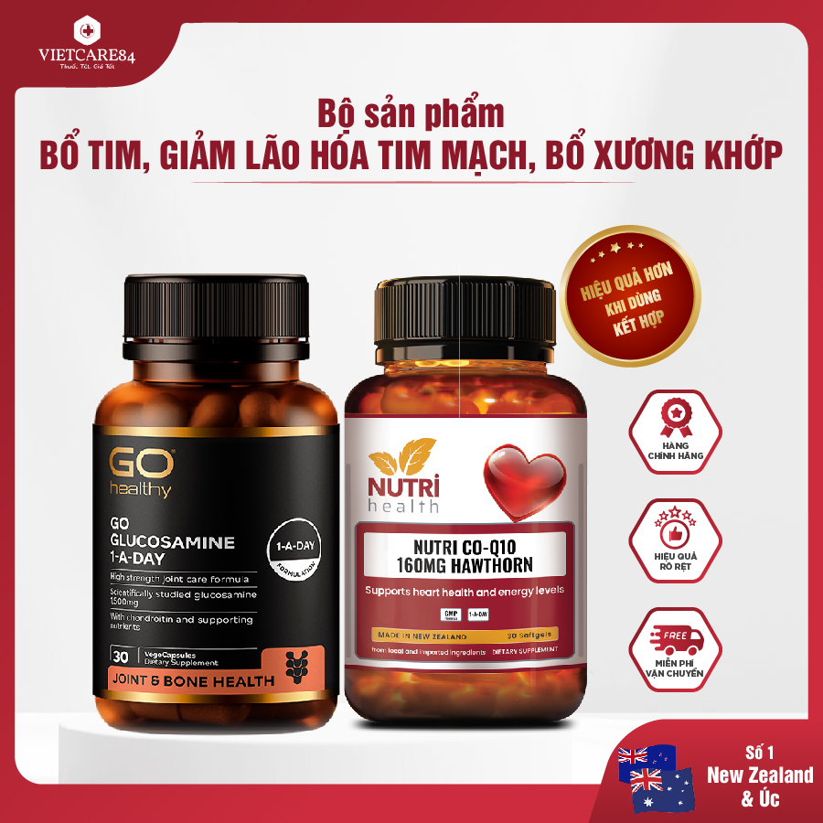 Mua tại TiktokThực phẩm bảo vệ sức khỏe Bộ Sản Phẩm Bổ Tim, Bổ Xương Khớp New Zealand: Bổ Tim Nutri Co Q10 160g Hawthorn -30 Viên; Go Glucosamine 1-A-Day 1500mg