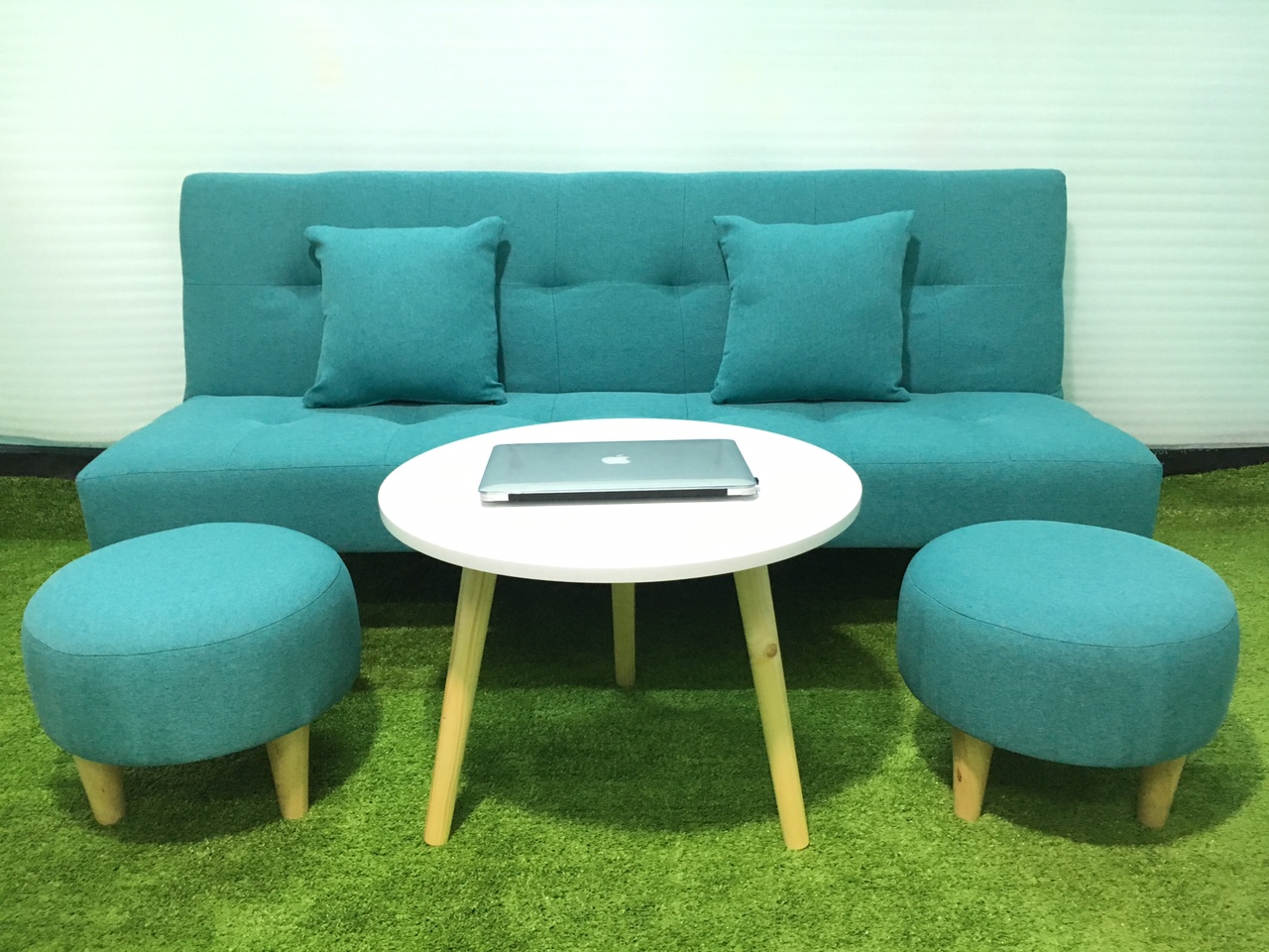 including sofa bed, 2 cushions, 2 ottomans and white table
