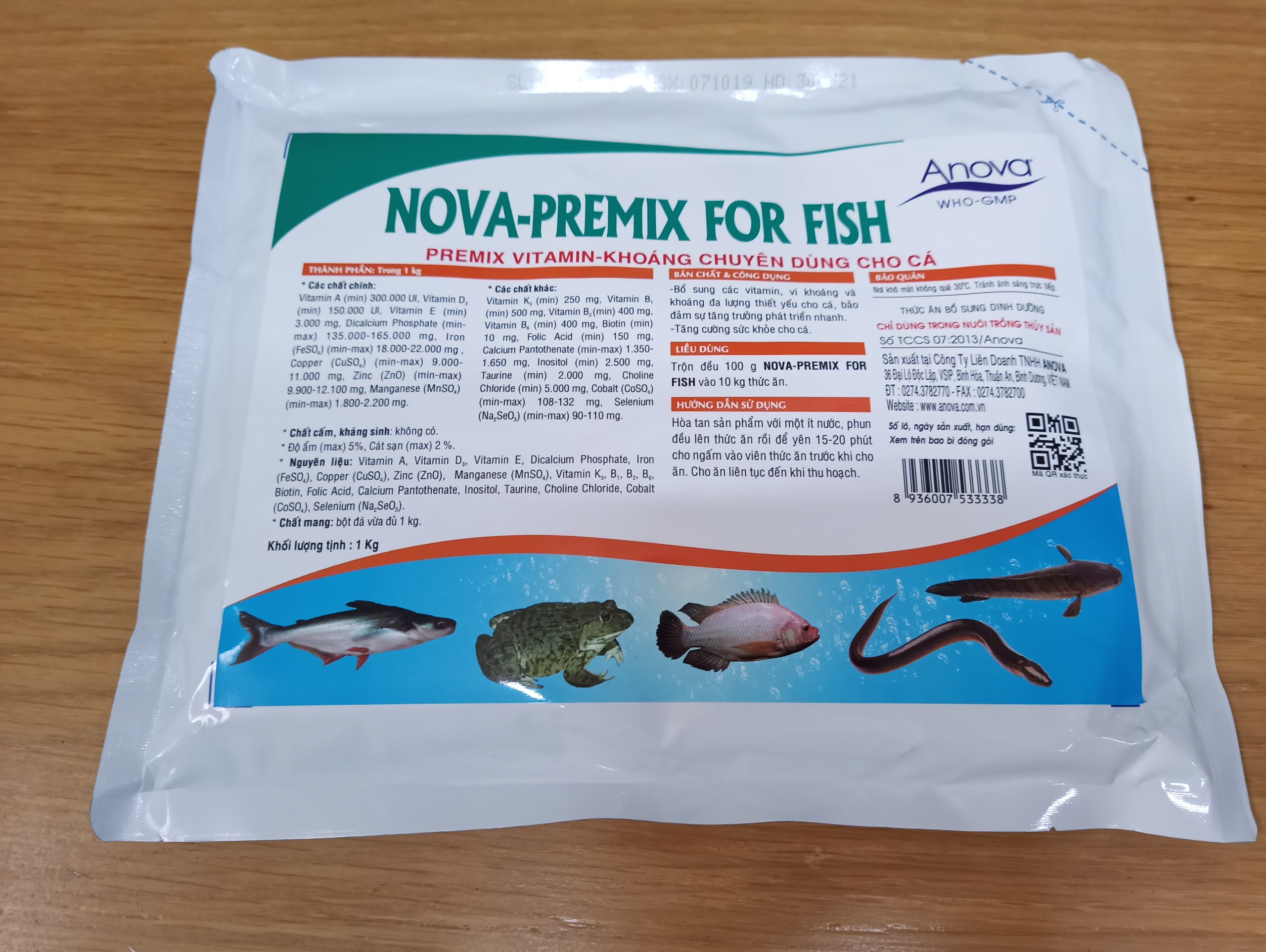 - Trộn đều: 100g Nova–Premix for fish vào 10 kg thức ăn. Cho ăn liên tục đến khi thu hoạch.