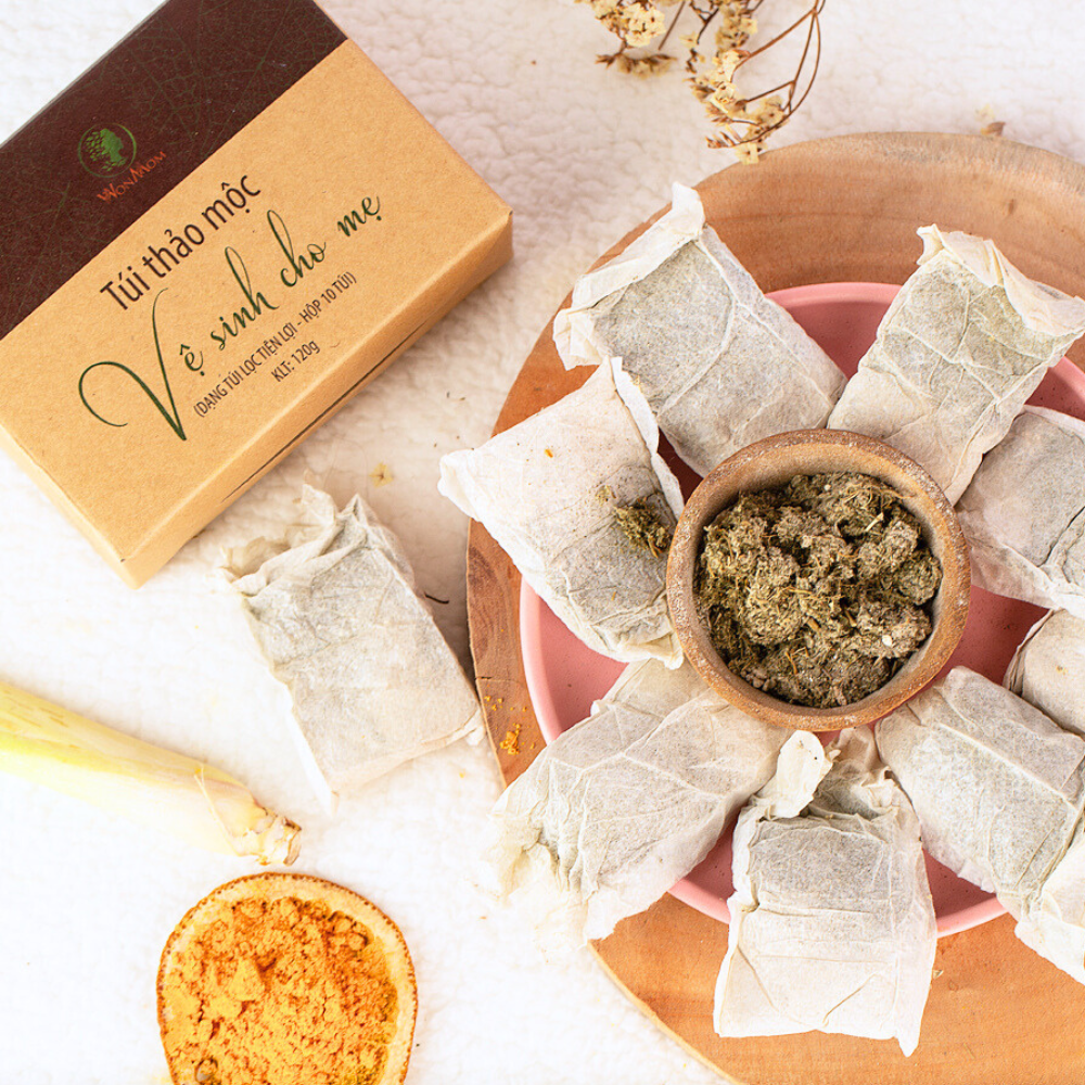 1.Thảo mộc vệ sinh cho mẹ được làm từ ngải cứu, xà sàng tử, nghệ, kim ngân hoa, trà xanh, dùng để xông cửa mình, khử mùi hôi ngứa, thơm tho, sạch sẽ và trẻ hóa hồng khít vùng chữ Y.