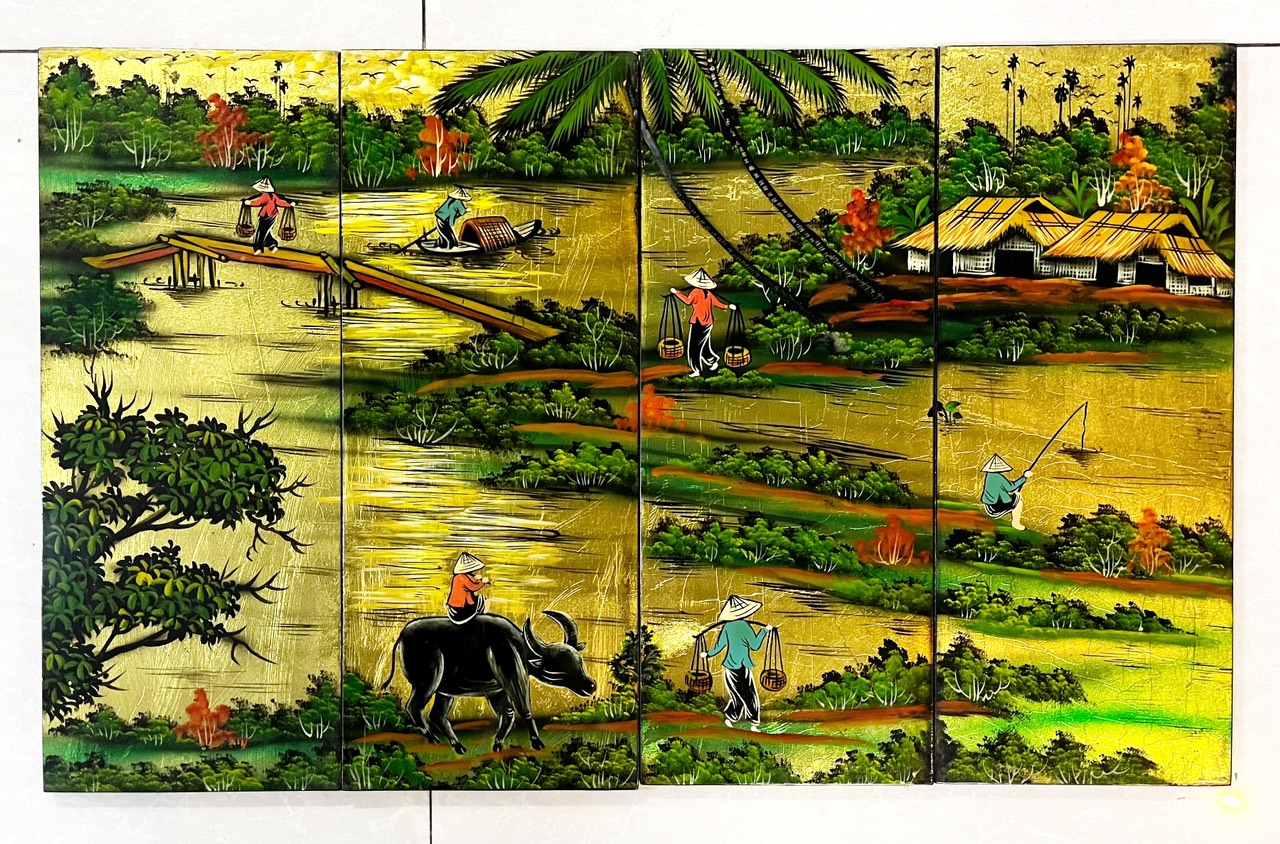 Tranh sơn mài bộ 4 tấm cảnh đồng quê 60x120 cm