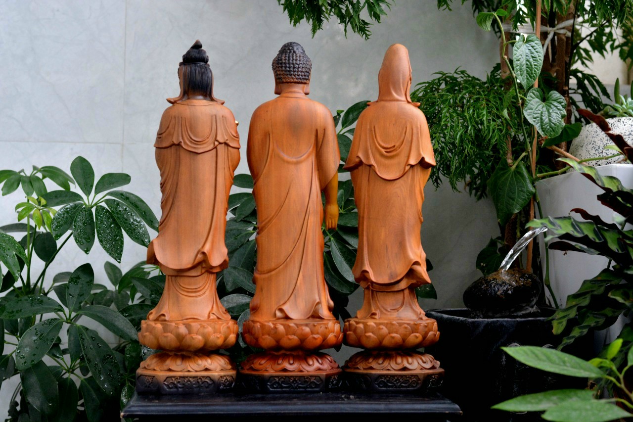 Bộ tượng phật tam thánh được làm bằng chất liệu gỗ hương đá liền khối tự nhiên 100%  Kích thước cao 50×15×14cm _ Bộ tượng phật tam thánh được trạm khắc vô cùng tỉ mỉ tinh sảo kỳ công .Đi hầu hết tất cả mọi chi tiết góc ngách nội dung hoa văn  của tượng đều được ngọt tỉa chỉnh sửa hoàn toàn bằng tay thủ công .Đồng thời Tượng được kiểm định kỹ lưỡng như cho vào thẩm sấy cho gỗ khô kiệt  Mục đích trống dập nứt vênh mo mối mọt ,Kết hợp với trà nhám ,đánh giấy giáp nhiều nước cho sạch sẽ ,Sờ mát lạnh ,Rồi cho vào phun lót làm bóng mờ để giữ lại mầu sắc vân gỗ tự nhiên .Cũng tô làm mầu giả cổ như ảnh trên .Bộ Tượng tam thánh được làm và hoàn thiện do bàn tay khối óc tài hoa từ những người thợ giàu kinh nghiệm cũng như tay nghề cao trong làng nghề truyền thống .Chính vì thế bộ tam thánh bằng gỗ hương đã đáp ứng đầy đủ những tiêu trí ( Đẹp bền rẻ ) Thẩm mỹ nghệ thuật với chất lượng tuyệt vời