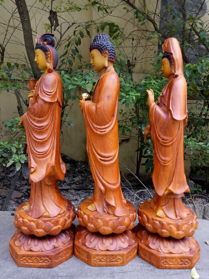 Bộ tượng phật tam thánh được làm bằng chất liệu gỗ hương đá liền khối khối tự nhiên 100%  Kích thước cao 40×12×12cm _ Bộ tượng phật tam thánh được trạm khắc tỉ mỉ ,Tinh sảo kỳ công .Đi hầu hết tất cả mọi chi tiết góc ngách nội dung hoa văn của bộ tam thánh .Đều được ngọt tỉa ,Chỉnh sửa hoàn toàn bằng tay thủ công .Đồng thời tượng được kiểm định kỹ lưỡng như cho vào thẩm sấy cho gỗ khô kiệt .Mục đích trống dập nứt vênh mo mối mọt .Kết hợp với trà nhám ,đánh giấy giáp nhiều nước ,Sờ mát lạnh rồi cho vào phun lót làm bóng mờ để giữ lại mầu sắc vân gỗ tự nhiên ,Bộ tam thánh được làm và hoàn thiện do bàn tay khối óc tài hoa ,Từ những người thợ giàu kinh nghiệm ,Cũng như tay nghề cao trong làng nghề truyền thống .Chính vì thế bộ tượng phật tam thánh đã đáp ứng đầy đủ những tiêu trí ( Đẹp bền rẻ ) Thẩm mỹ nghệ thuật với chất lượng tuyệt vời