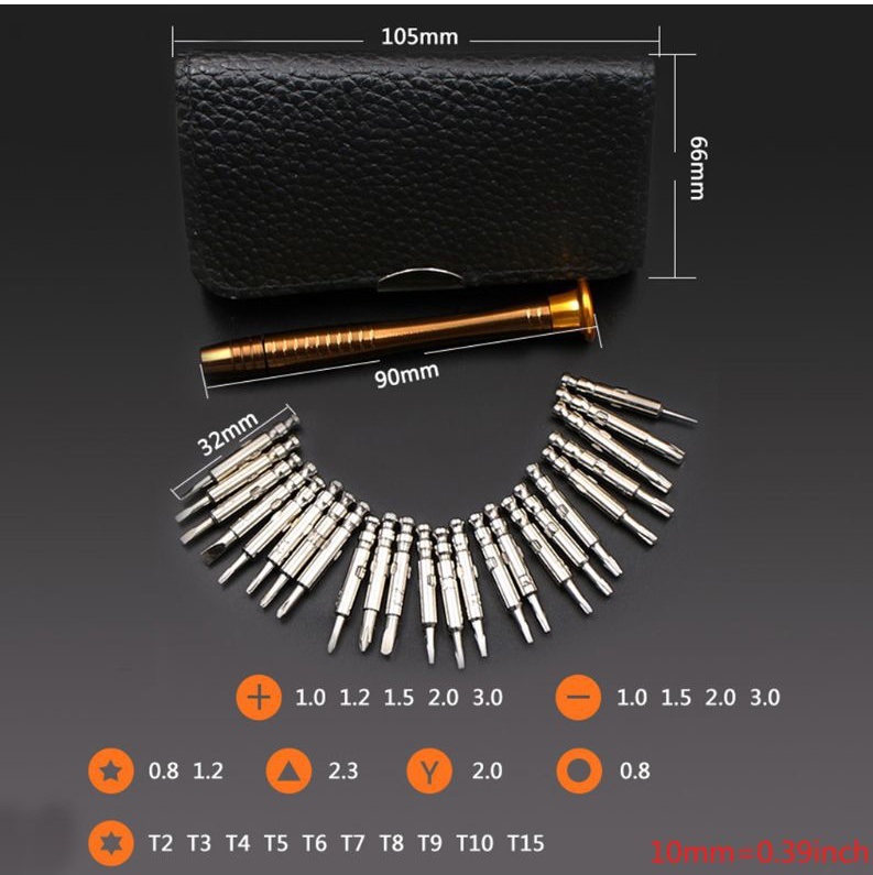 - Bộ tua vít 25 đầu: đầy đủ các dạng đầu như dẹt, 2 lỗ, tam giác, lục giác, các loại đầu từ 3 đến 6 cạnh. Mỗi dạng đầu gồm nhiều kích thước khác nhau, đảm bảo mở được tất cả các linh kiện.