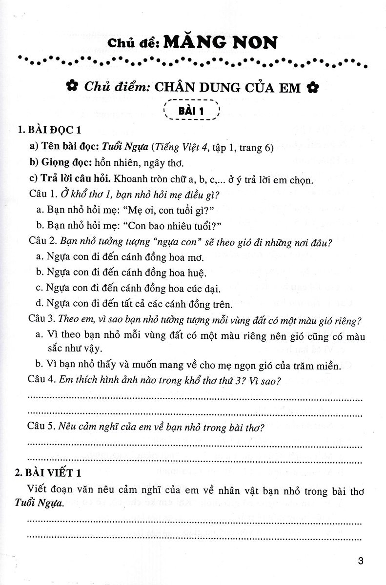 - Bồi dưỡng tình yêu tiếng Việt, hình thành thói quen giữ gìn sự trong sáng và giàu đẹp của Tiếng Việt, góp phần hình thành nhân cách con người Việt Nam hiện đại. Các bài tập giúp em ôn luyện Gợi ý làm bài cho mỗi tuần Ngoài ra, cuốn sách còn cung cấp thêm một số dàn bài, những bài văn mẫu và những câu chuyện kể trong và ngoài nước nhằm cung cấp thêm nguồn tư liệu để các em tham khảo và vận dụng vào các bài học