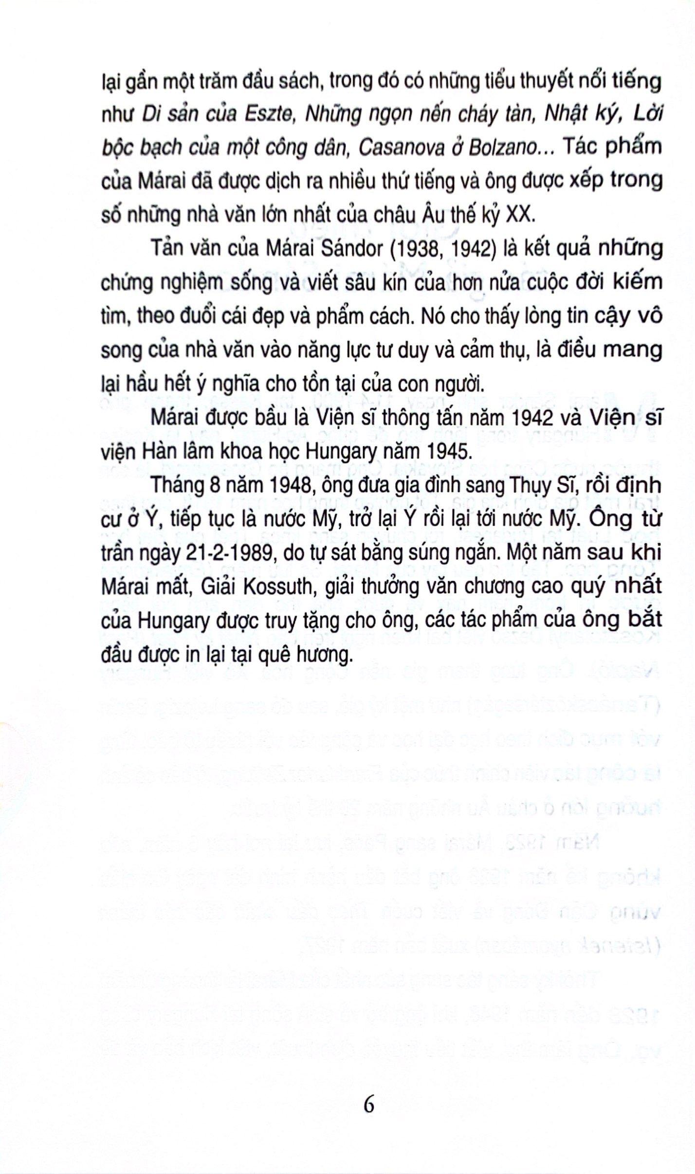 Bằng ngôn từ tinh tế nhưng sắc bén, khả năng theo đuổi những liên tưởng vừa trữ tình đáng kinh ngạc, Márai đồng thời tạo ra một thế giới ứ đầy chất thơ, với vẻ đẹp tráng lệ và não nùng của cuộc sống đang vận động đến sự lụi tàn sầu thảm tất yếu, nhưng kiêu hãnh với những giá trị tinh thần bền vững.