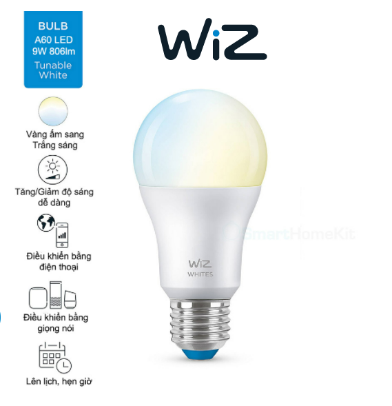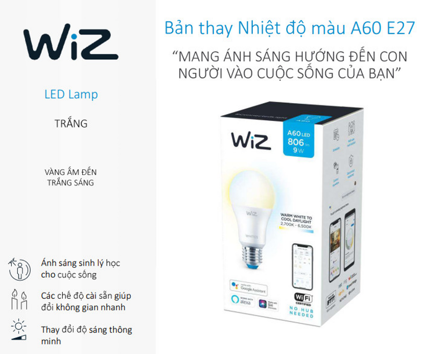 Mua tại TiktokWIZ bóng đèn thay đổi nhiệt độ màu " Mang ánh sáng hướng đến con người vào cuộc sống của bạn" Wiz LED LAMP với thiết kế bóng đèn màu trắng và thay đổi được nhiệt độ màu từ ánh sáng vàng ấm đến ánh sáng trắng (2700K-6500K).