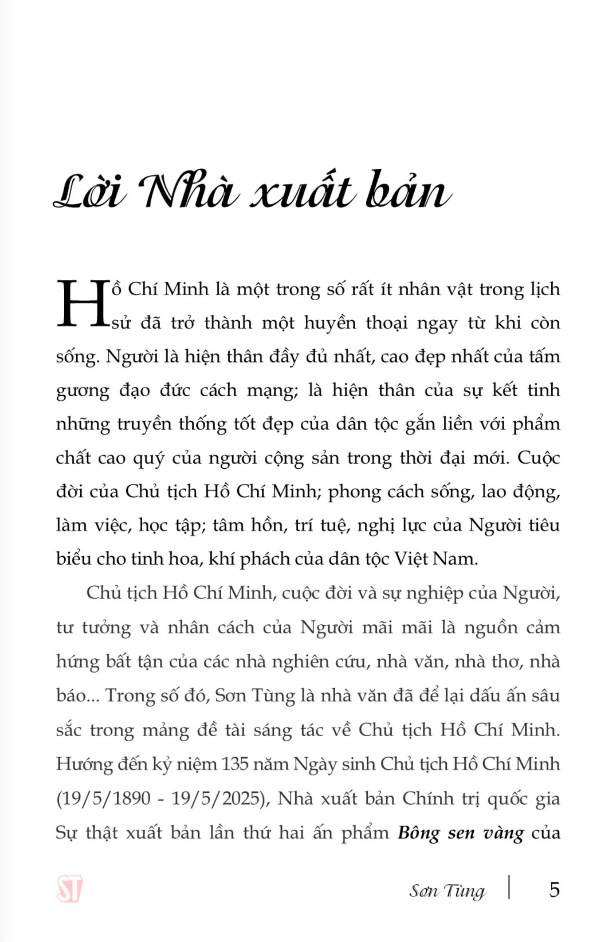 Chủ tịch Hồ Chí Minh, cuộc đời và sự nghiệp của Người, tư tưởng và nhân cách của Người mãi mãi là nguồn cảm hứng bất tận của các nhà nghiên cứu, nhà văn, nhà thơ, nhà báo… Trong số đó, Sơn Tùng là nhà văn đã để lại dấu ấn sâu sắc trong mảng đề tài sáng tác về Chủ tịch Hồ Chí Minh. Nhân dịp kỷ niệm 35 năm (1987 - 2022) UNESCO vinh danh Chủ tịch Hồ Chí Minh là Anh hùng giải phóng dân tộc, Nhà văn hóa kiệt xuất, Nhà xuất bản Chính trị quốc gia Sự thật xuất bản ấn phẩm BÔNG SEN VÀNG của Nhà văn Sơn Tùng. Đây là một trong số những tác phẩm nổi tiếng của ông viết về thời niên thiếu của Chủ tịch Hồ Chí Minh.