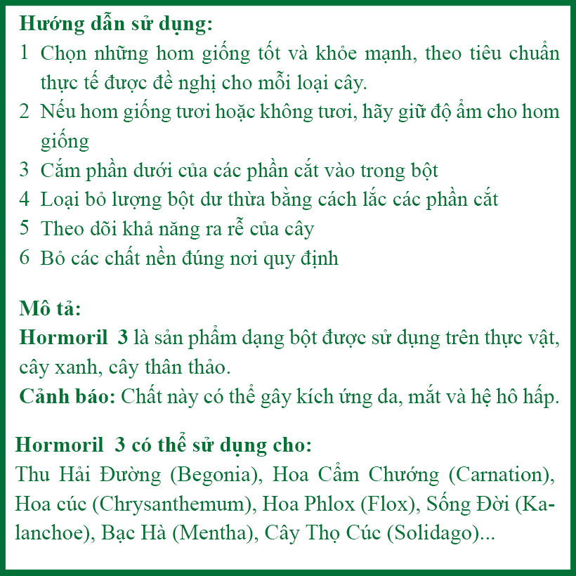 HORMORIL T-3 (bột rễ có chứa thành phần diệt nấm): T with fungicide cực kỳ quan trọng đối với một số giống cây giâm cành nhạy cảm với vi khuẩn bên ngoài.