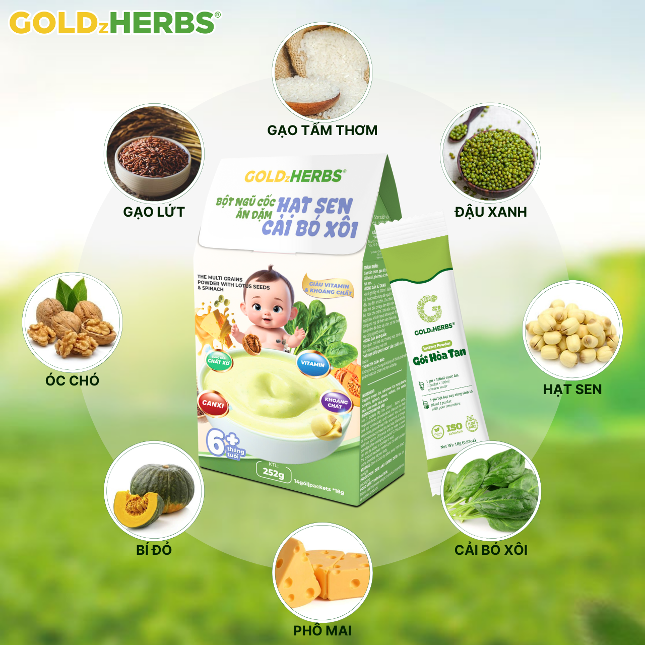 ✨Bột ngũ cốc ăn dặm hạt sen cải bó xôi GoldzHerbs cho bé từ 6 tháng tuổi – 252g/ 500g