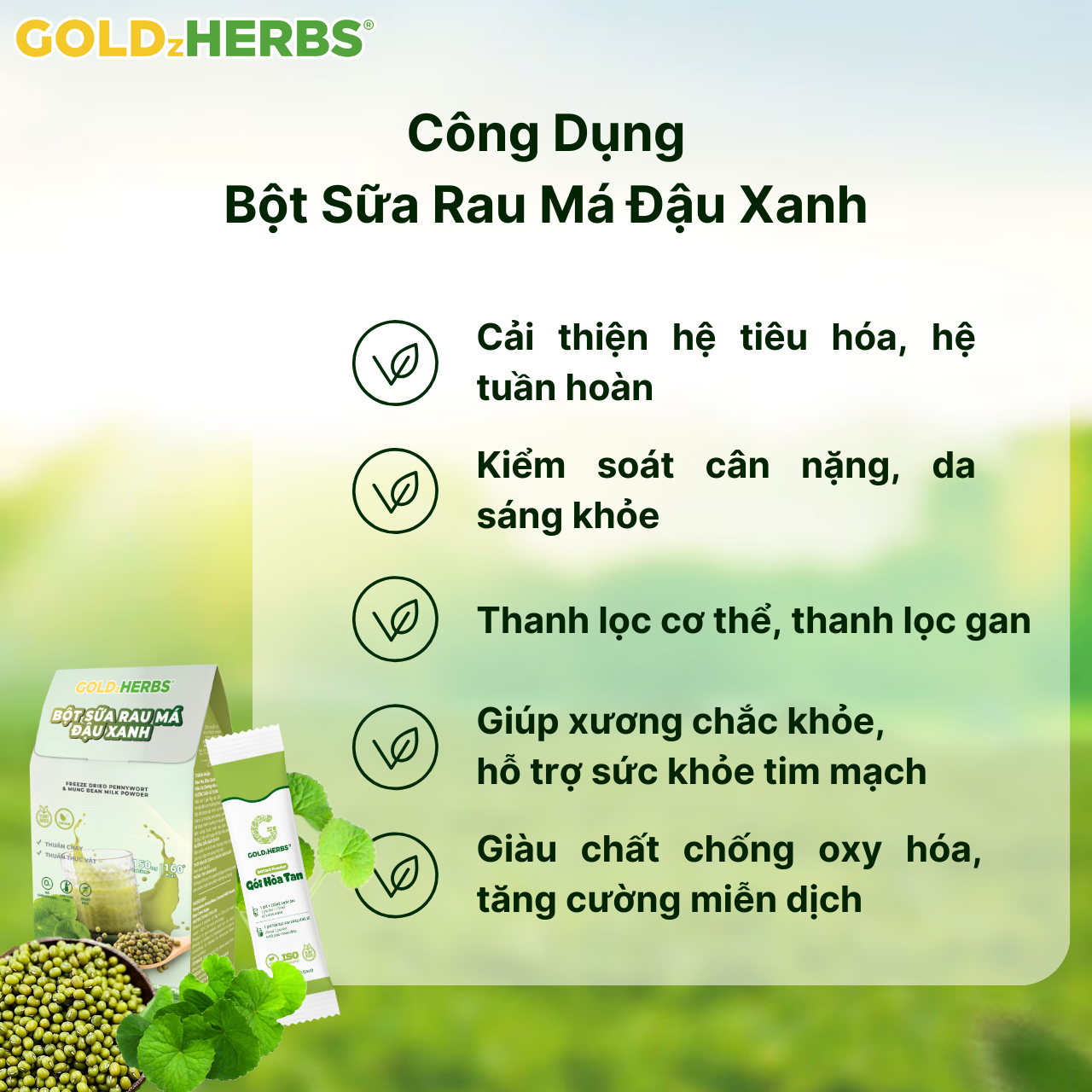 Bột sữa rau má đậu xanh GoldzHerbs CÔNG DỤNG - Giải nhiệt, thanh mát cơ thể. - Giàu chất xơ, hỗ trợ tiêu hóa. - Cung cấp năng lượng từ đậu xanh. - Giảm viêm,