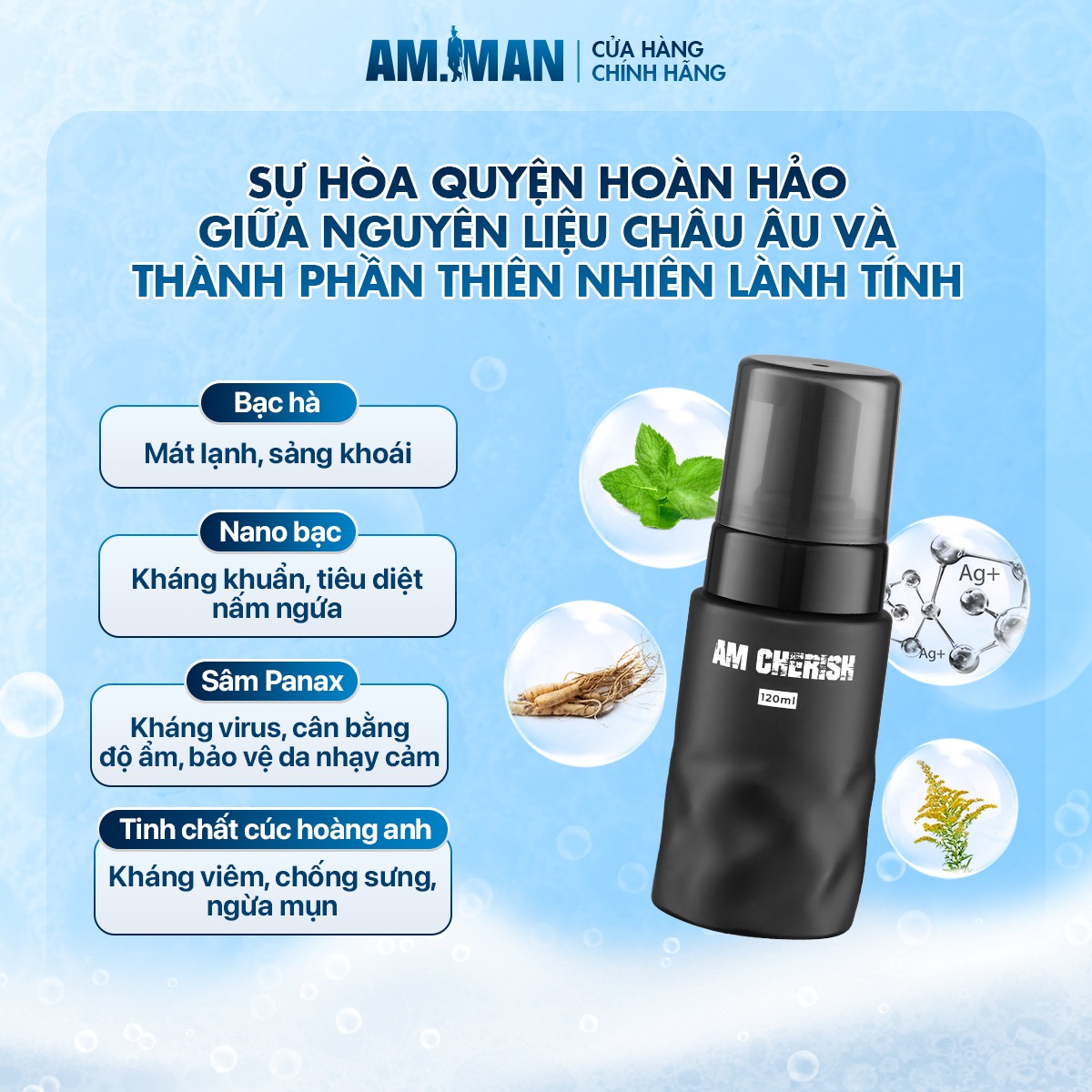 Mua tại TiktokBọt vệ sinh nam AM-MAN AM CHERISH 120ml hương nước hoa cao cấp THÔNG TIN THƯƠNG HIỆU: AM-MAN là thương hiệu chăm sóc cá nhân dành cho Nam Giới đã được cấp phép của Sở Y Tế, tuân thủ đầy đủ các tiêu chuẩn an toàn và mọi thông tin về sản phẩm, nguyên liệu đều được kiểm nghiệm khắt khe và minh bạch. Với danh mục sản phẩm đa dạng, phù hợp với mọi nhu cầu chăm sóc cá nhân khác nhau của phái mạnh, AM-MAN hướng tới sự toàn diện, hiện đại, trẻ trung, năng động giúp mỗi ngày với phái mạnh đều là 1 ngày ý nghĩa. CÔNG DỤNG BỌT VỆ SINH NAM AM CHERISH: