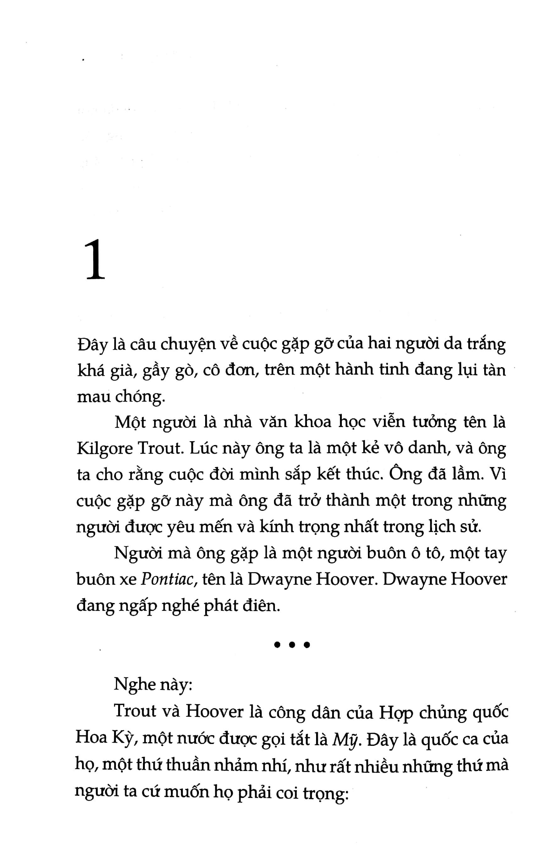 Kilgore Trout là một nhà văn già chuyên sáng tác truyện khoa học viễn tưởng, hầu như vô danh bởi chẳng ai biết rằng tác phẩm của ông có tồn tại. Một ngày nọ, ông bỗng có độc giả nghiên tức đầu tiên - Dwayne Hoover, một doanh nhân giàu có. Chỉ có điều, Dwayne lại nghiêm túc đến độ hiểu mọi thứ Trout viết theo nghĩa đen, để rồi rút cục trở nên điên loạn.