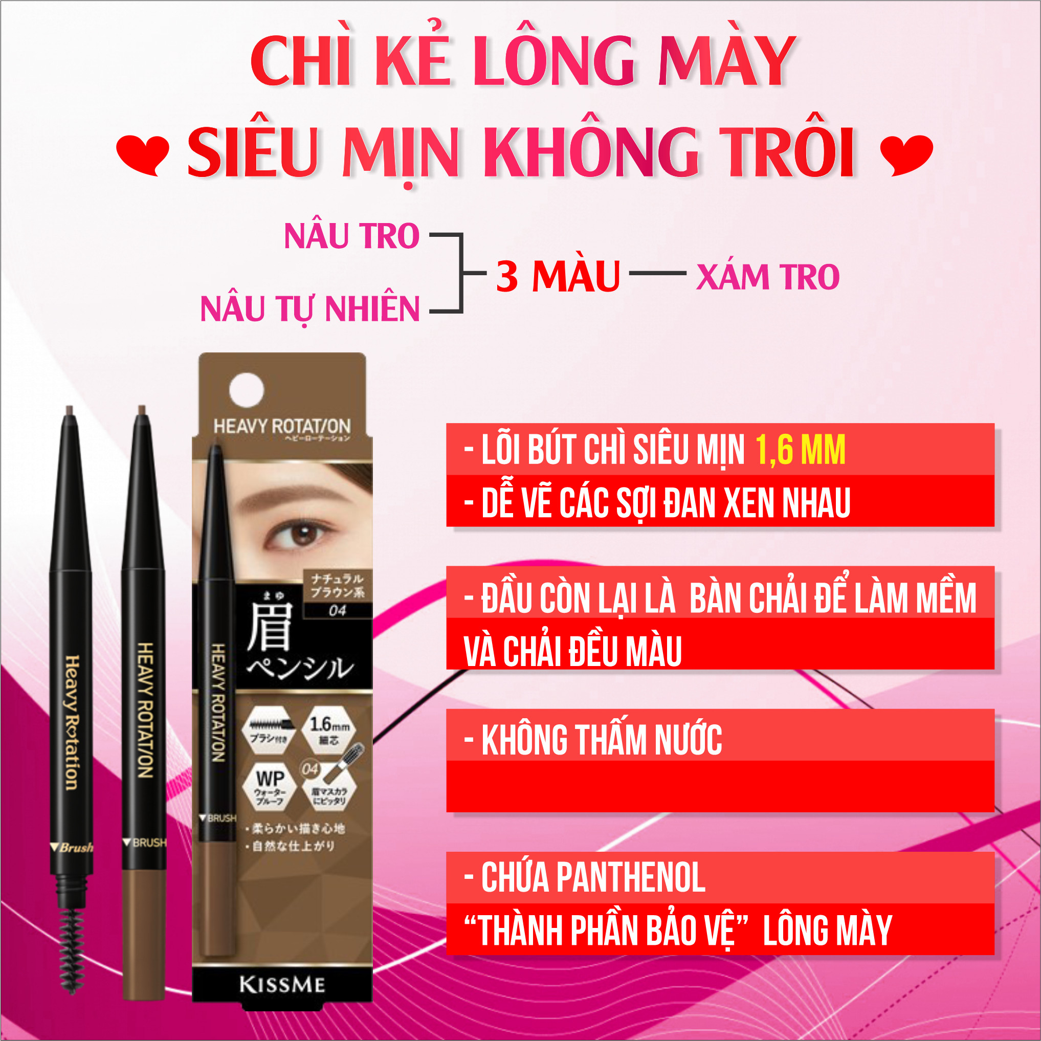 Mua tại TiktokBút Chì Sáp Kẻ Lông Mày Chống Trôi Lõi Siêu Mịn Màu Nâu Tro Kissme Heavy Rotation Eyebrow Pencil Thông tin sản phẩm: Số Lô: In trên sản phẩm Thương hiệu Kissme Xuất Xứ: Nhật Bản Khối lượng tịnh : 0.09g HSD: 5 năm kể từ ngày sản xuất Lõi sáp siêu mịn , chỉ 1,6 mm được tạo ra từ các thành phần làm đẹp, kết hợp công thức chống trôi cải tiến , giúp dễ vẽ các sợi đan xen nhau bằng những nét vẽ siêu mượt tự nhiên ,không gây cọ xát, hoặc vón cục và giữ bền màu vẽ . Đặc biệt Panthenol giúp hạn chế gãy rụng lông mày sau thời gian sử dụng. 1/ Công dụng :