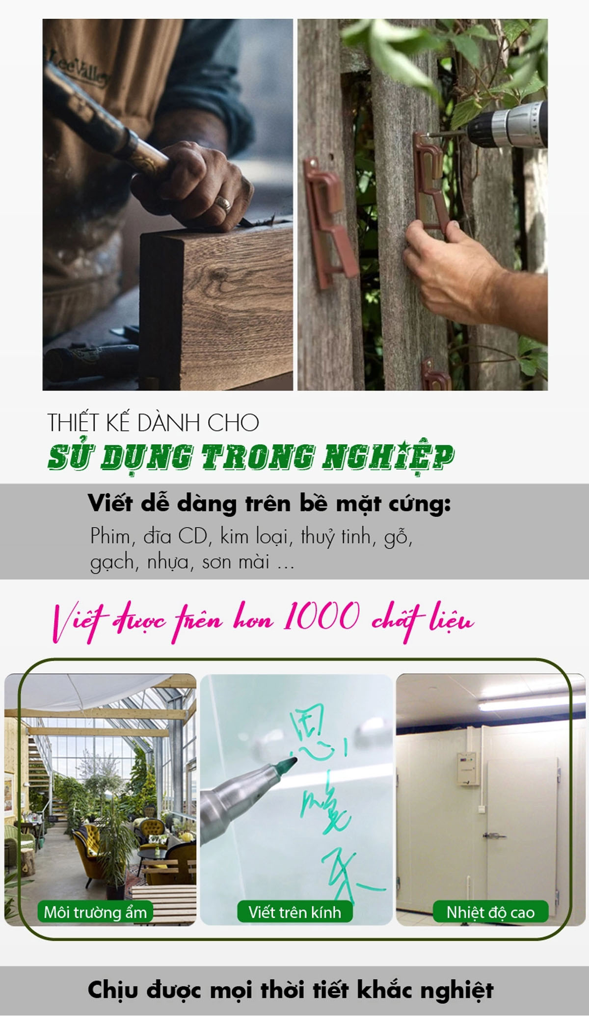 - Viết được trong mọi điều kiện môi trường khắc nghiệt: nóng, lạnh, mưa - Viết được trên mọi bề mặt trơn, tạo cảm giác thoải mái khi viết - Mực không chất độc hại,