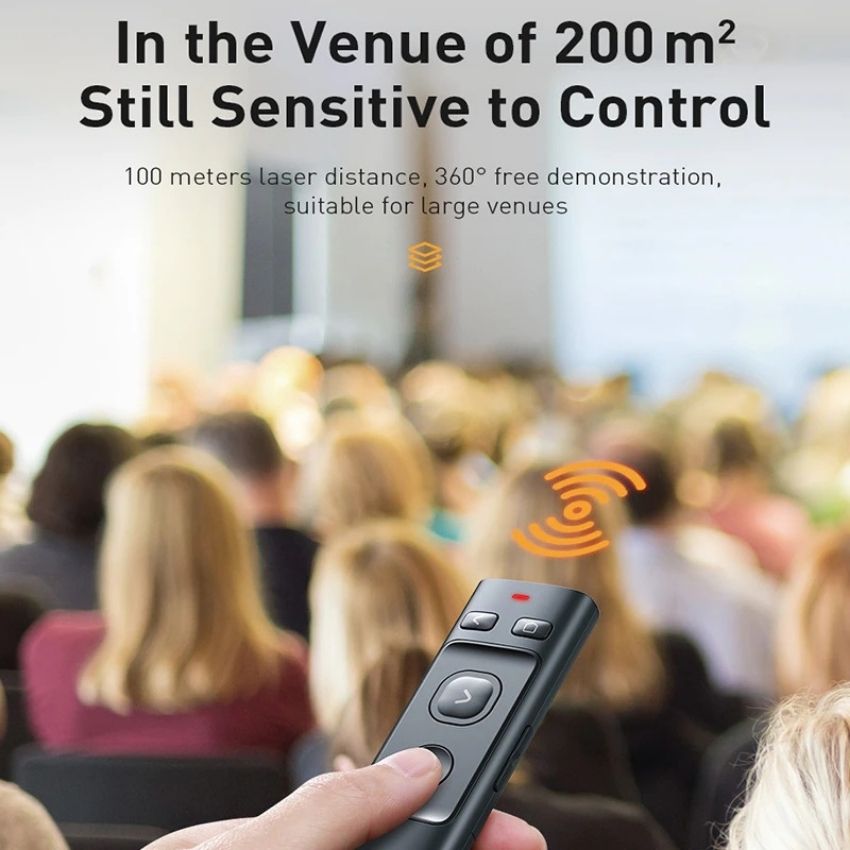 - Bút trình chiếu Baseus còn được tích hợp công nghệ không dây hiện đại cho độ nhạy cao RF2.4G, tránh nhiễu hiệu quả, ổn định khoảng cách xa đến 100m. Giúp người dùng có thể kiểm soát tốt slideshow trong không gian đến 200m², hỗ trợ tối ưu trong mọi nhu cầu sử dụng từ văn phòng đến lớp học.