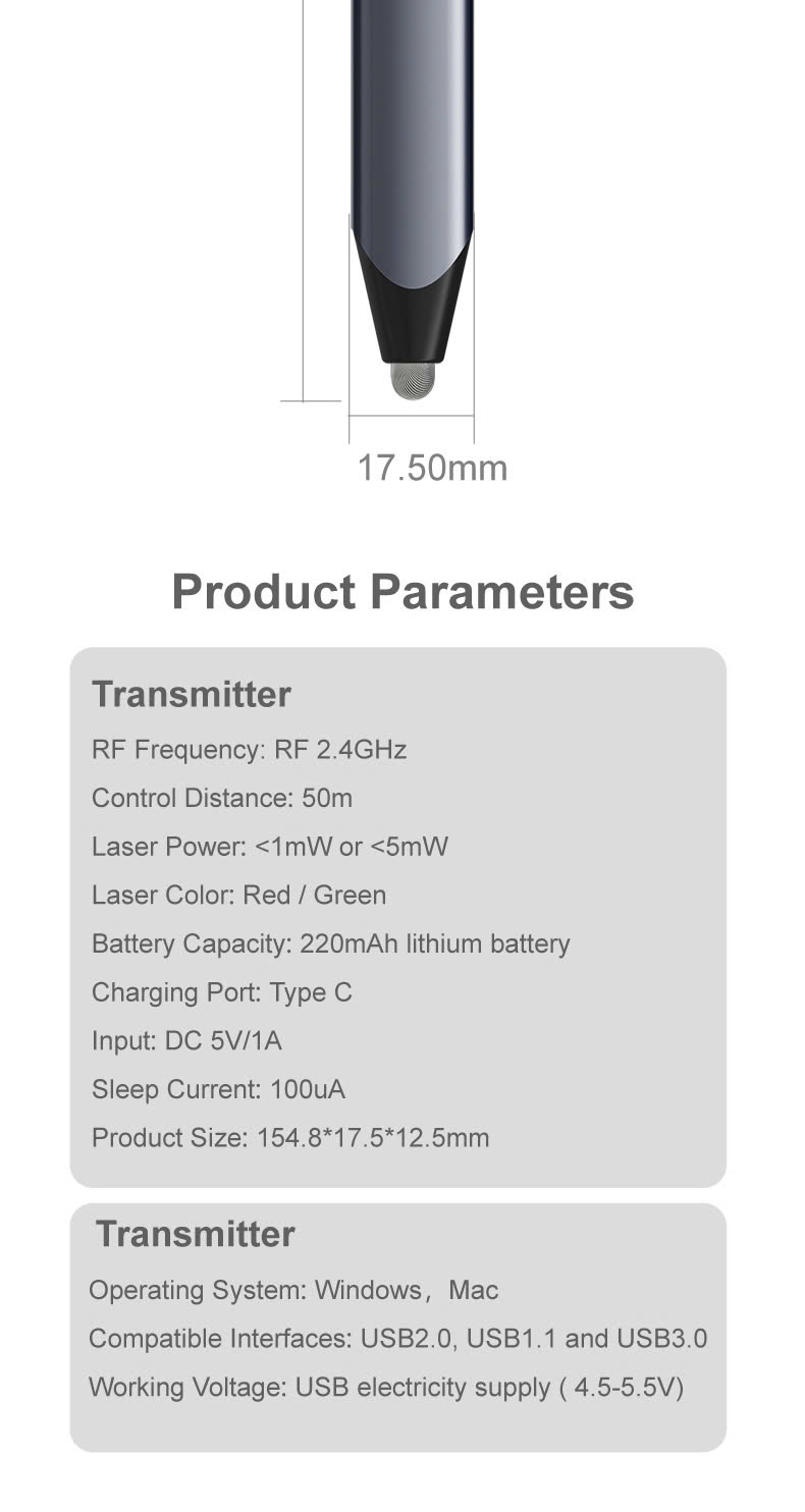1. Tính năng: sử dụng trình chiếu, thuyết trình, word, PowerP 2. Led: màu đỏ 3. Sử dụng: Pin AAA 4. Khoảng cách chiếu Led: 100-200M 5. Khoảng cách điều khiển: sóng 2.4Ghz lên đến