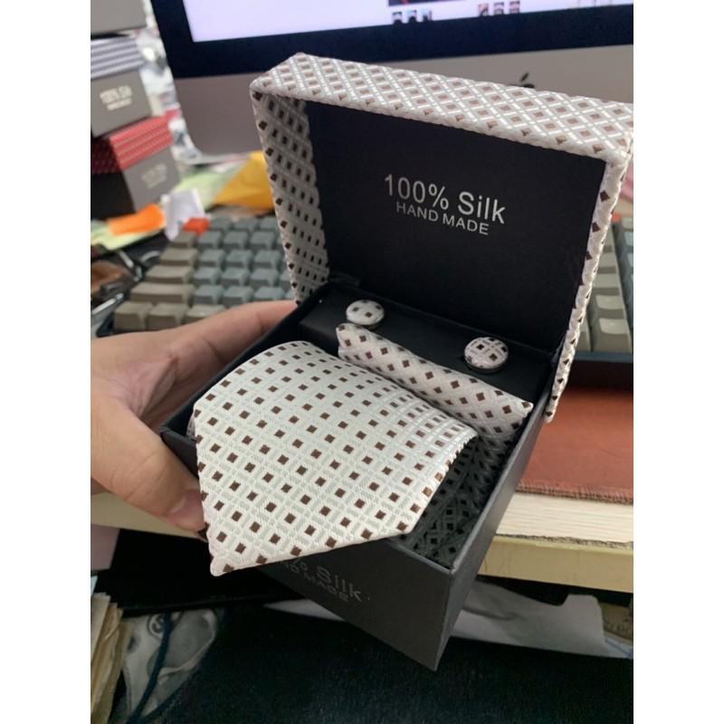 Hộp quà tặng gồm 1 cà vạt nam 8cm kích cỡ chuẩn 8cmx150 k. 1 hộp đựng cà vạt , 01 Khăn túi áo véc 20x20 cm , 1 cặp khuy áo măng sét cũng