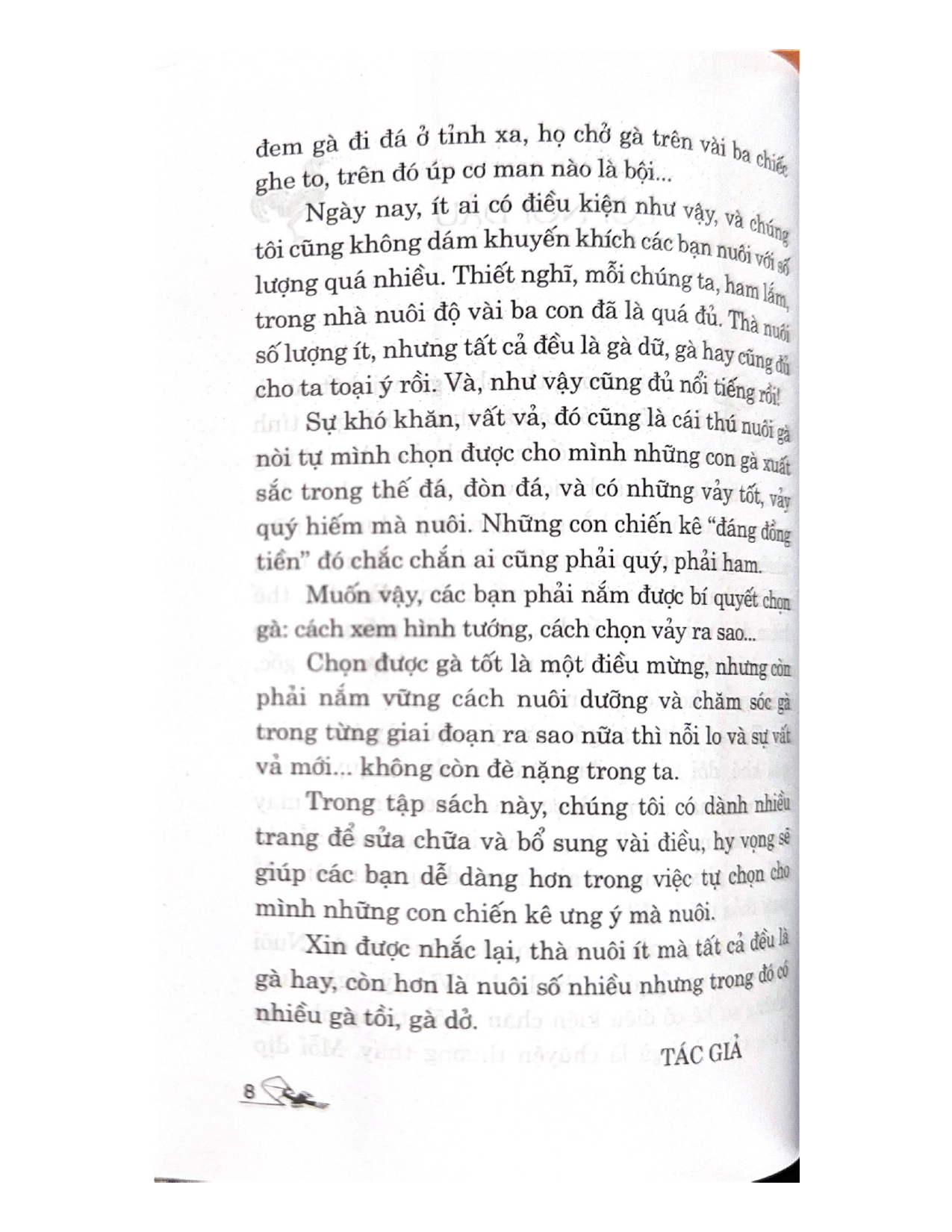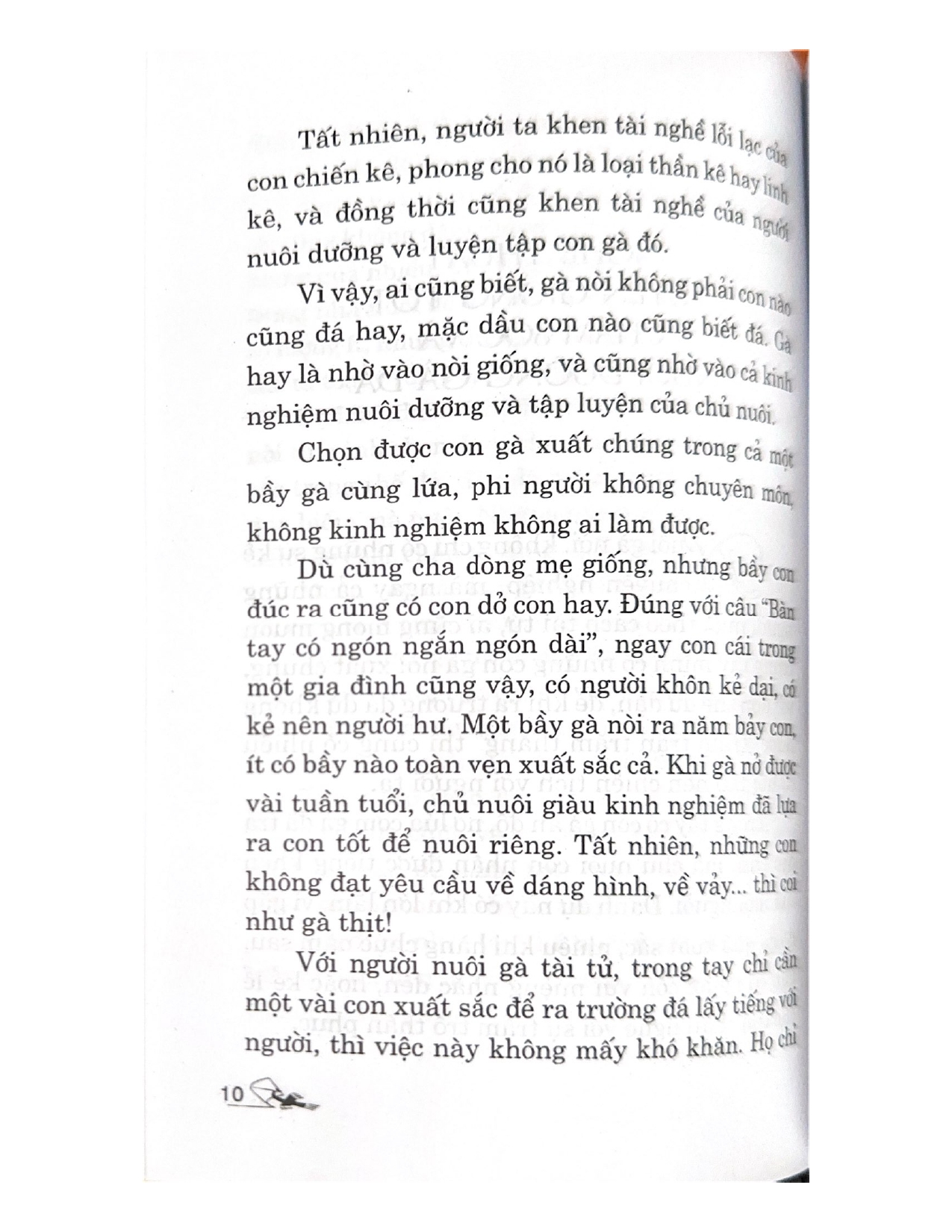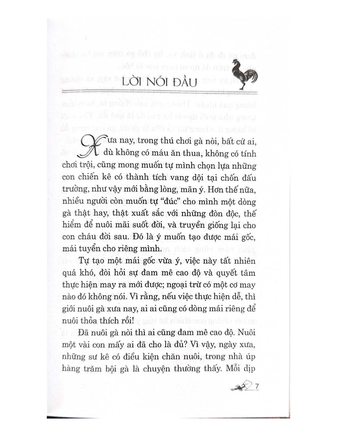 - Giới thiệu Cách Chọn Gà Đá Xưa nay, trong thú chơi gà nòi, bất cứ ai, dù không có máu ăn thua, không có tính chơi trội, cũng mong muốn tự mình chọn lựa những con chiến kê có thành tích vang dội tại chốn đấu trường, như vậy mới bằng lòng mãn ý. Hơn thế nữa, nhiều người còn muốn tự “đúc” cho mình dòng gà thật hay, thật xuất sắc với những đòn độc, thế hiểm để nuôi mãi suốt đời, và truyền giống lại cho con cháu đời sau. Đó là ý muốn tạo được mái gốc, mái tuyển cho riêng mình. Tự tạo một mái gốc vừa ý, việc này tất nhiên quá khó, đòi hỏi sự đam mê cao độ và sự quyết tâm thực hiện của mình, may ra mới được. Ngoại trừ có một cơ may nào thì không nói. Vì rằng, nếu việc thực hiện dễ, thì giới nuôi gà xưa nay, ai ai cũng có dòng mái riêng để nuôi thoả thích rồi! Đã nuôi gà nòi thì ai cũng đam mê cao độ. Nuôi một vài con mấy ai đã cho là đủ? Vì vậy, ngày xưa, những sự kê có điều kiện chăn nuôi, trong nhà úp hàng trăm bội gà là chuyện thường thấy. Mỗi dịp đem gà đi đá ở tỉnh xa, họ chở gà trên vài ba chiếc ghe to, trên đó úp cơ man nào là bội… Ngày nay, ít ai có điều kiện như vậy, và chúng tôi cũng không dám khuyến khích các bạn nuôi với số lượng quá nhiều. Thiết nghĩ, mỗi chúng ta, ham lắm, trong nhà nuôi độ vài ba con đã là quá đủ. Thà nuôi số lượng ít nhưng, tất cả đều gà dữ gà hay cũng đủ cho ta toại ý rồi. Và, như vậy cũng đủ nổi tiếng rồi! Sự khó khăn, vất vả, đó cũng là cái thú nuôi gà nòi tự mình chọn được cho mình những con gà xuất sắc trong thế đá, đòn đa, và có những vảy tốt, vảy quí hiếm mà nuôi. Những con chiến kê “đáng đồng tiền” đó chắc chắn ai cũng phải quí, phải ham. Muốn vậy, các bạn phải nắm được bí quyết chọn gà cách xem hình tướng, cách chọn vảy ra sao… Chọn được gà tốt là một điều mừng, nhưng còn phải nắm vững cách nuôi dưỡng và chăm sóc gà trong từng giai đoạn ra sao nữa thì nỗi lo và sự vất vả mới… không còn để nặng trong ta nữa. Cuốn sách "Cách chọn gà đá" này sẽ đem lại cho bạn đọc các kiến thức cần thiết