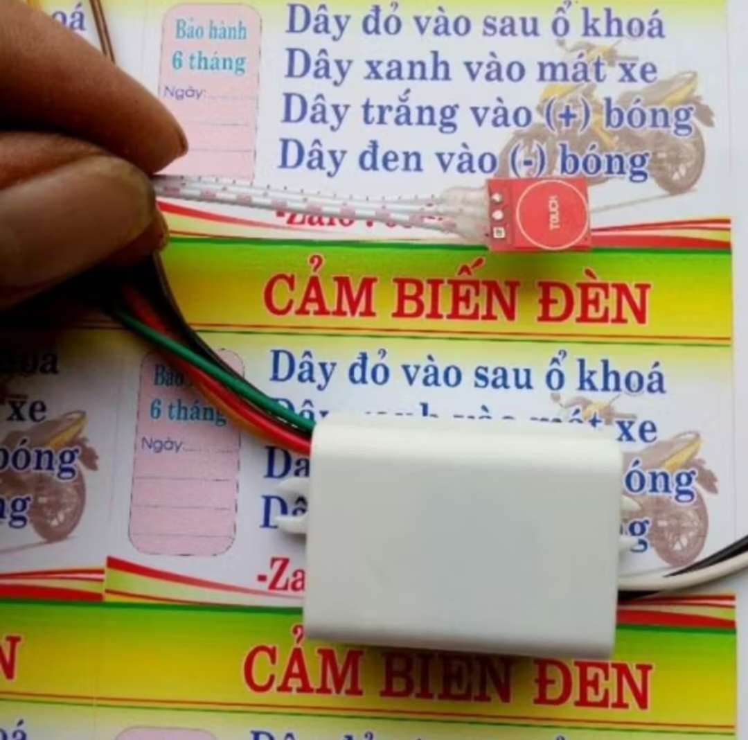 các bạn chỉ cần dán cảm biến vào trong miếng nhựa xe máy là xong.và các bạn chạm vào thả tay ra là nó sáng.và chạm lại thả tay ra là nó tắt.