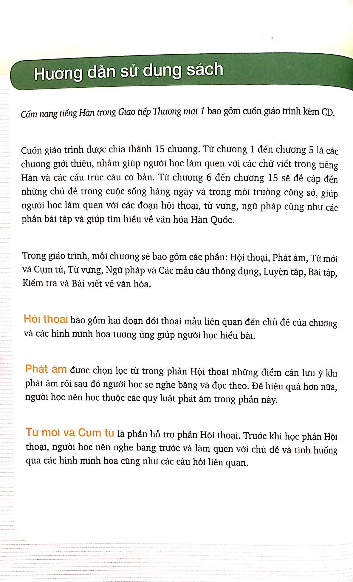 Mong rằng bộ sách Cẩm nang tiếng Hàn trong Giao tiếp Thương mại sẽ là một bộ giáo trình thiết thực, giúp ích cho các lao động người nước ngoài có thể học ngôn ngữ và tìm hiểu văn hoá Hàn quốc một cách dễ dàng và thú vị hơn. Mong rằng quyển sách này có thể giúp mở rộng vốn hiểu biết về ngôn ngữ tiếng Hàn cho mọi người.