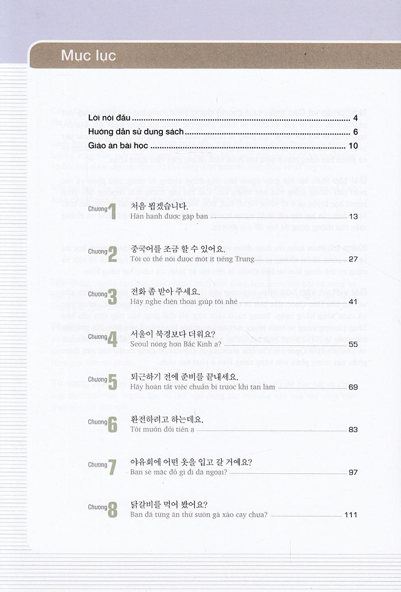 Mỗi cuốn giáo trình được chia thành 15 chương. Từ chương 1 đến chương 5 giúp người học làm quen với các chữ viết trong tiếng Hàn và các cấu trúc câu cơ bản. Từ chương 6 đến chương 15 đề cập đến những chủ đề trong cuộc sống hàng ngày và trong môi trường công sở, giúp người học làm quen với các đoạn hội thoại, từ vựng, ngữ pháp cũng như các phần bài tập và giúp tìm hiểu về văn hoá Hàn Quốc.