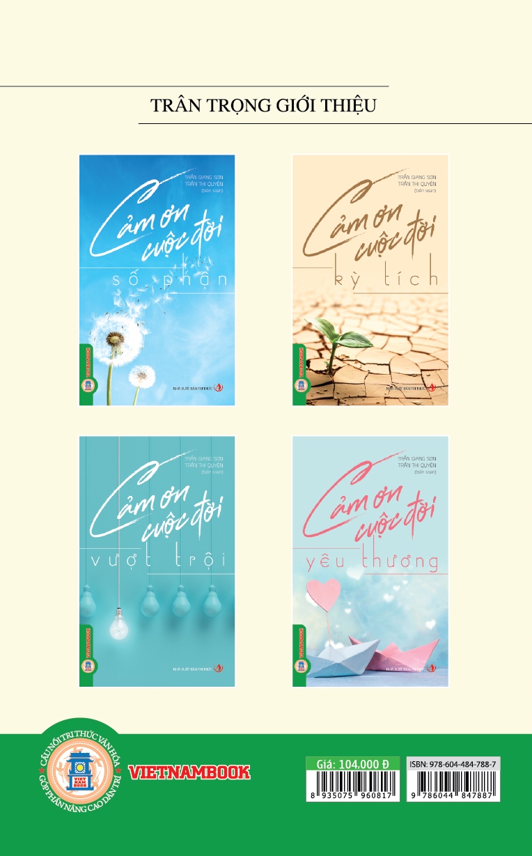 Mua tại TiktokBộ sách “Cảm ơn cuộc đời” gồm 4 quyển, chia sẻ những khoảnh khắc tuyệt diệu của cuộc sống, giúp mỗi người chúng ta có cơ hội nhìn lại và thấu hiểu giá trị thực sự của những điều xung quanh, từ đó thêm yêu cuộc sống, làm cho cuộc đời trở nên vui vẻ, hạnh phúc và hoàn mỹ hơn. Những kinh nghiệm trong cuộc sống và công việc với khả năng tư duy, đạo đức tốt, sự nỗ lực cố gắng của con người: không ngừng sáng tạo, luôn biết nhìn nhận vấn đề, nắm bắt cơ hội, đặt ra mục tiêu và thực hiện cho bằng được, thể hiện bản thân bằng niềm say mê, cách làm việc có phương pháp và hiệu quả.