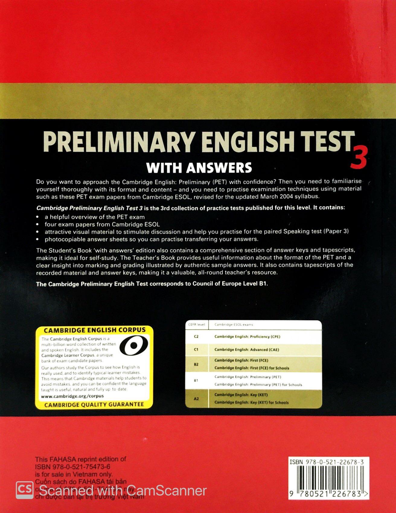 Mua tại TiktokThe Cambridge Preliminary English Test 3 practice tests provide candidates with an excellent opportunity to familiarise themselves with the 2004 PET exam and to practise examination techniques. The Student's Book contains practice material for Paper 1 (Reading and Writing) and Paper 2 (Listening), along with attractive colour visual material for Paper 3 (Speaking), enabling students to prepare thoroughly for the paired Speaking test. The Student's Book is available with or without answers .