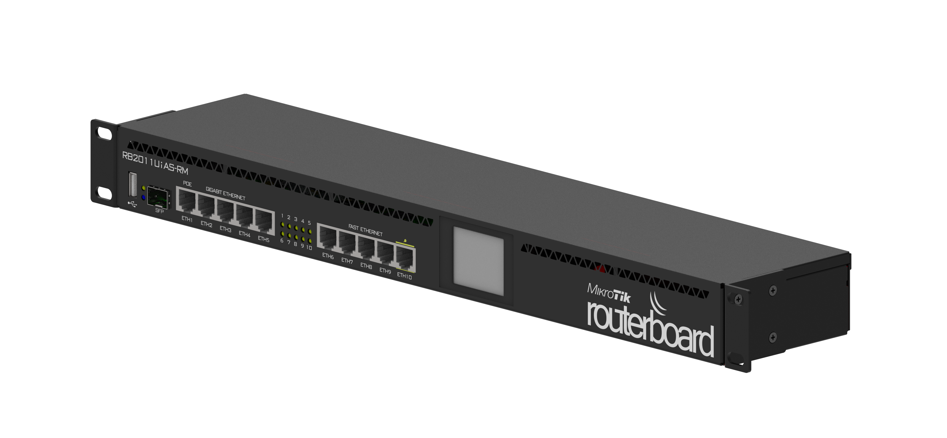 The RB2011 is a low cost multi port device series. Designed for indoor use, and available in many different cases, with a multitude of options. The RB2011 is powered by RouterOS, a fully featured routing operating system which has been continuously improved for fifteen years. Dynamic routing, hotspot, firewall, MPLS, VPN, advanced quality of service, load balancing and bonding, real-time configuration and monitoring - just a few of the vast number of features supported by RouterOS. RouterBOARD 2011UiAS-RM, in comparison with RB2011L series, not only has five Gigabit LAN ports and five Fast Ethernet LAN ports, but also has RJ45 serial port, USB port and more RAM (128MB instead of 64MB). Also, it has RouterOS L5 license (instead of L4) and nice touchscreen LCD for configuration. SFP cage is also present (SFP module not included!) There is PoE output function for port #10 - it can power other PoE capable devices with the same voltage as applied to the unit. Maximum load on the port is 500mA. Tested and recommended to use with MikroTik SFP modules: S-85DLC05D, S-31DLC20D and S-35/53LC20D (not included) RouterBOARD 2011UiAS-RM comes with 1U rackmount enclosure, LCD panel and power supply.