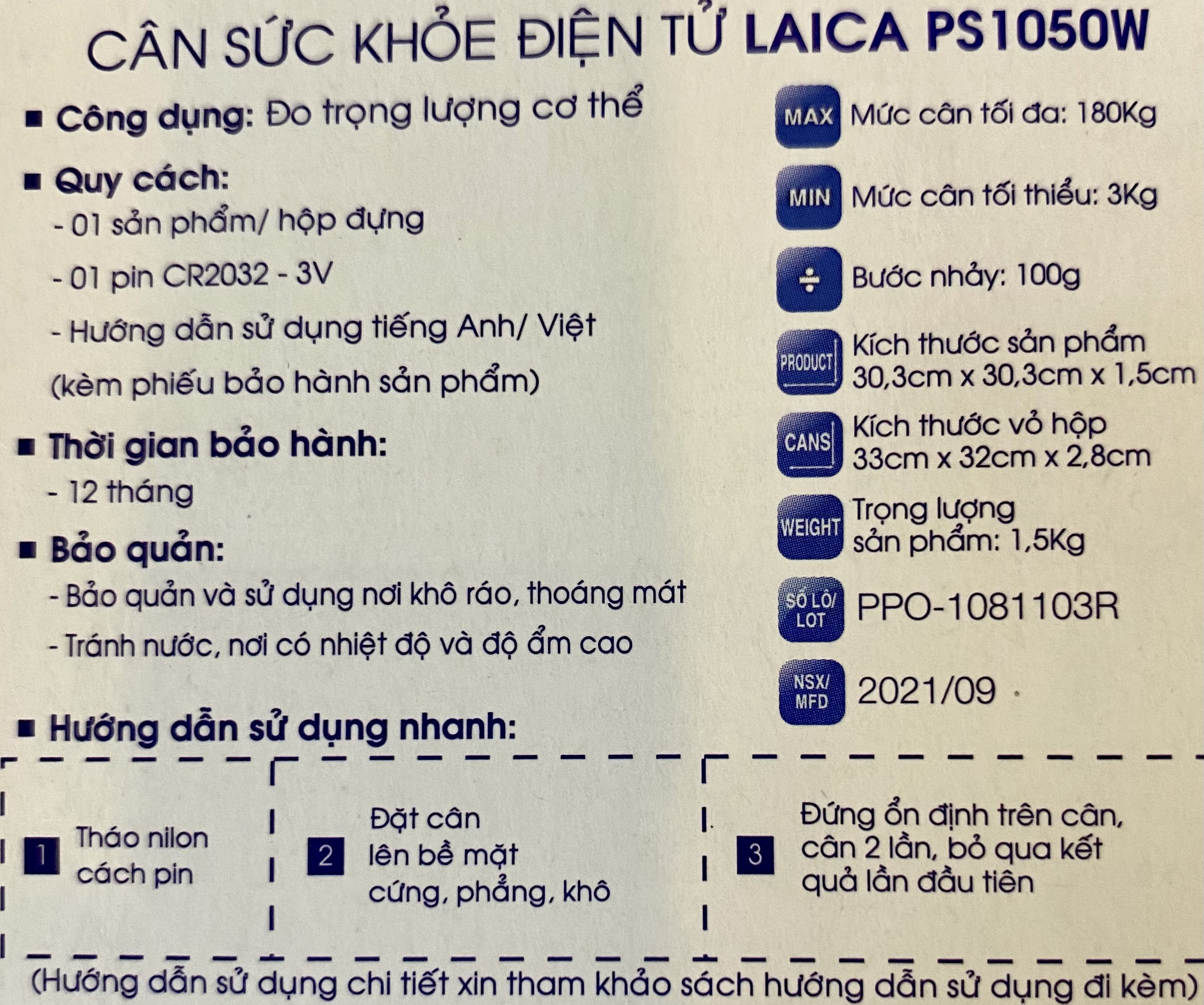 - Cân sử khỏe điện tử Laica PS1050 chỉ sử dụng với mục đích đo trọng lượng cơ thể không sử dụng mục đích khác hoặc thương mại