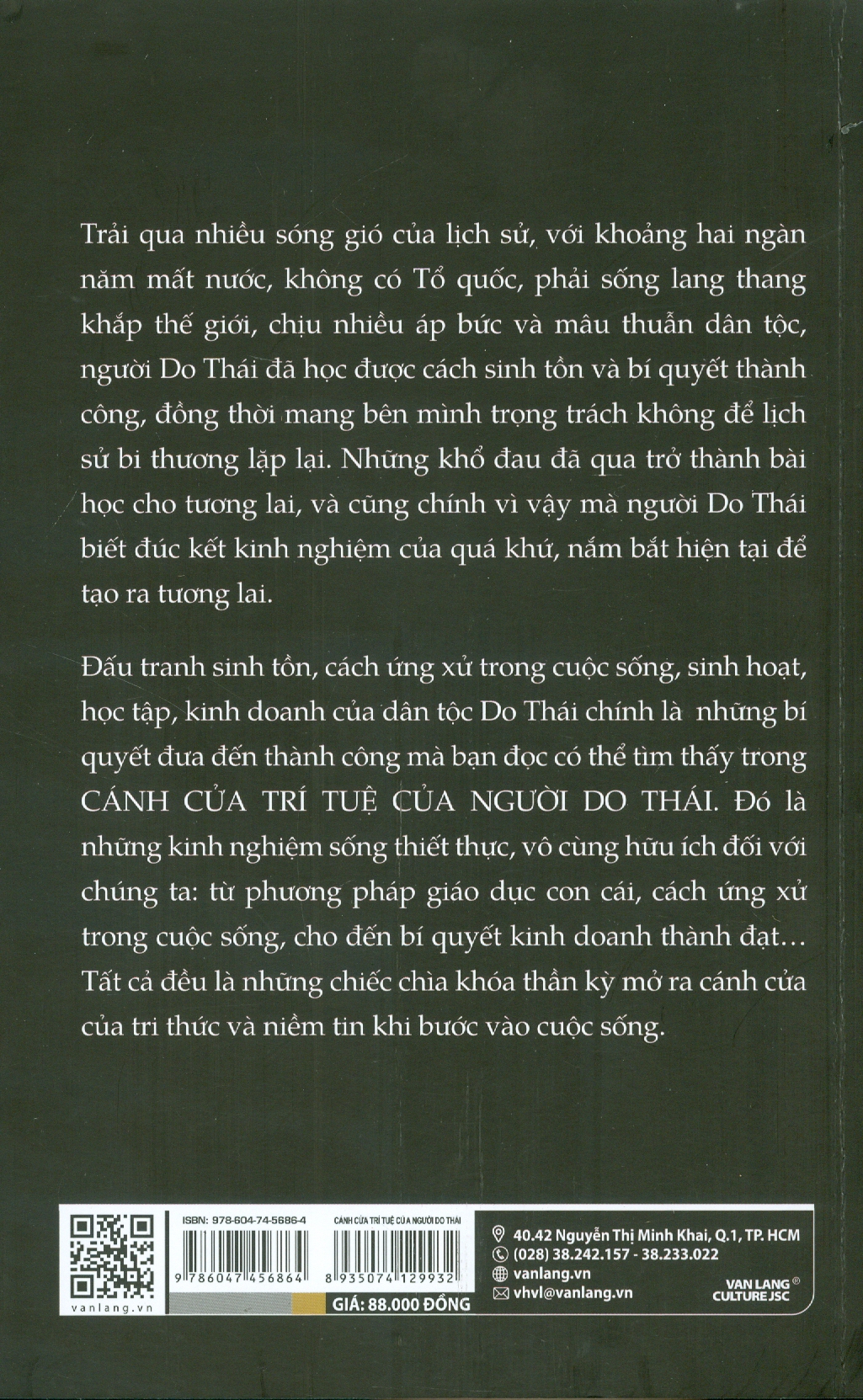 Đấu tranh sinh tồn, cách ứng xử trong cuộc sống, sinh hoạt, học tập, kinh doanh của dân tộc Do Thái chính là những bí quyết đưa đến thành công mà bạn đọc có thể tìm thấy trong Cánh cửa trí tuệ của người Do Thái. Đó là những kinh nghiệm sống thiết thực, vô cùng hữu ích đối với chúng ta: từ phương pháp giáo dục con cái, cách ứng xử trong cuộc sống, cho đến bí quyết kinh doanh thành đạt… Tất cả đều là những chiếc chìa khóa thần kỳ mở ra cánh cửa của tri thức và niềm tin khi bước vào cuộc sống.