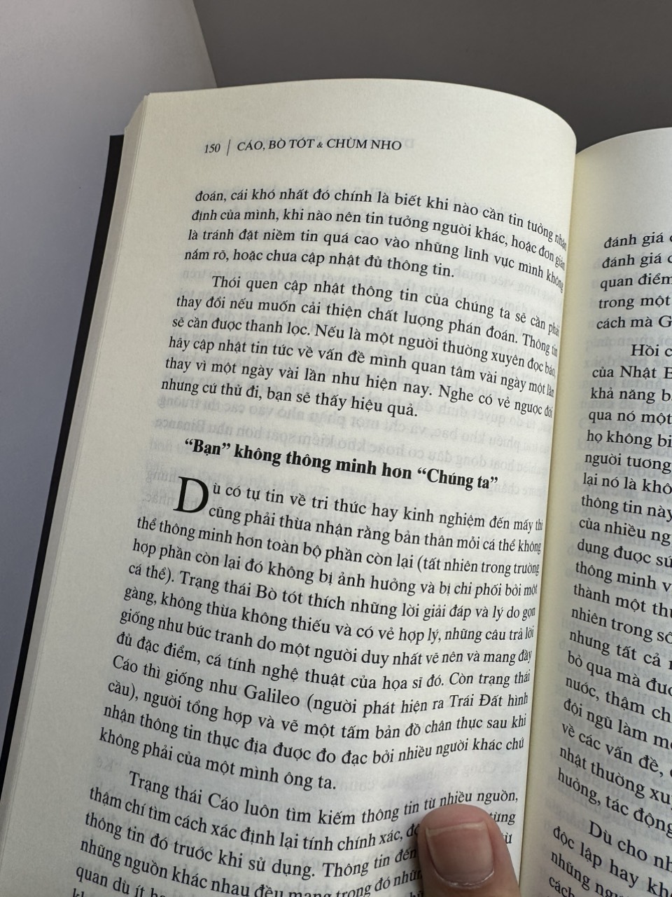 Trong cuốn sách này, bằng việc xây dựng lại cốt truyện, Cáo đã có thêm Bò tót làm bạn đồng hành trên hành trình tìm kiếm và hái những chùm nho. Câu chuyện mới được kể lại và phân tích qua 9 chương từ góc nhìn tâm lý học, người đọc sẽ đồng hành cùng Cáo và Bò tót trong quá trình phán đoán, tiếp nhận, xử lý thông tin, đi kiếm tìm và giao dịch những chùm nho quý báu. Khi khép lại cuốn sách, người đọc sẽ giật mình nhận ra rằng trong khi dành phần lớn thời gian để suy nghĩ và hành động một cách bản năng, chúng ta lại tự cho rằng mình sáng suốt và lý trí, thực tế này đến ngay cả khi chúng ta đã cố gắng áp dụng các phương pháp tư duy phản biện đã học hay đọc được ở đâu đó.