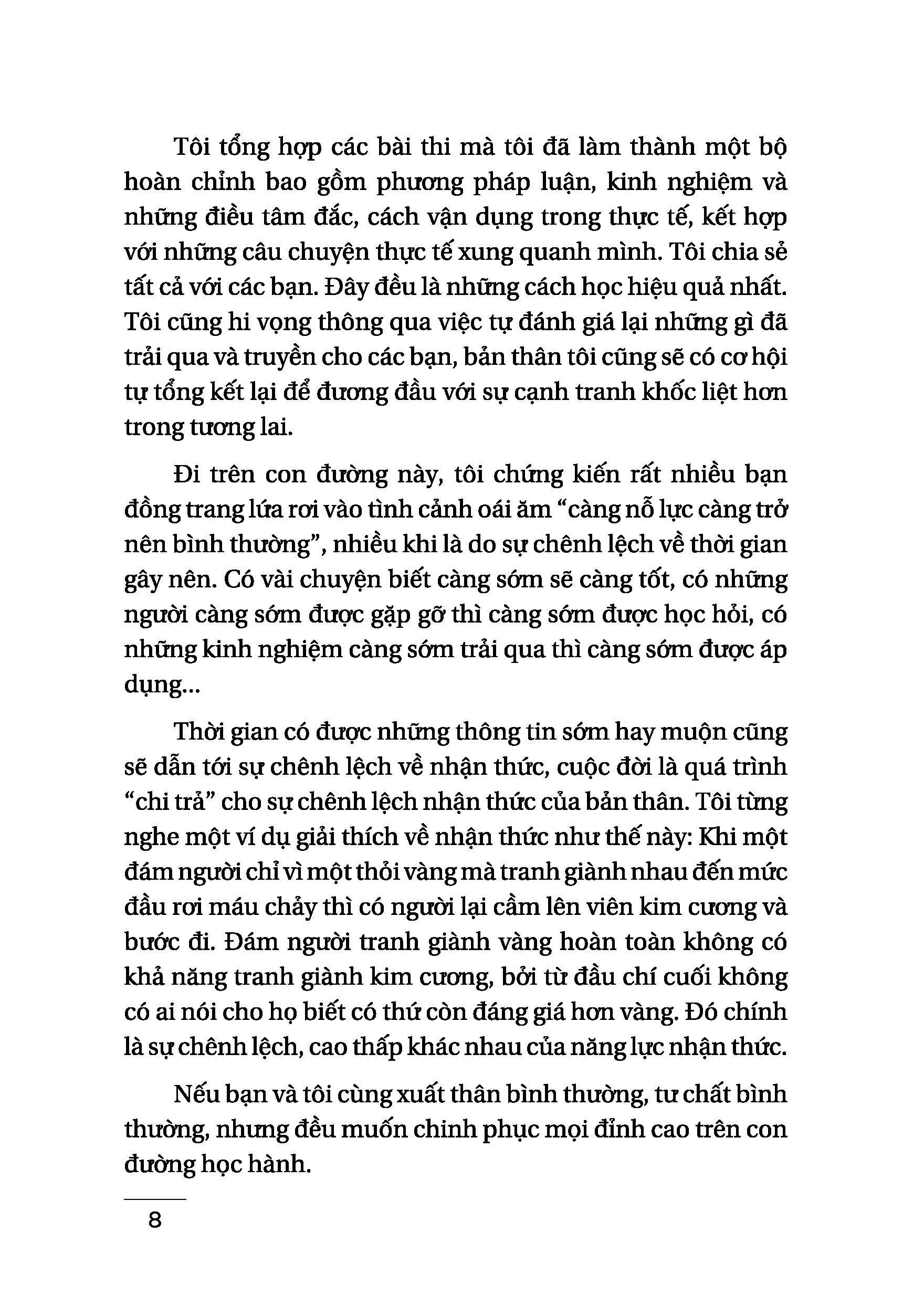 Thiên tài chỉ chiếm 1% dân số, họ thực ra không cần phải học, không cần phải cố gắng, cũng không cần phải rèn luyện… Còn đa số chúng ta không phải là người như vậy. Trong quá trình học tập, anh tổng hợp các bài thi thành một bộ hoàn chỉnh bao gồm phương pháp luận, kinh nghiệm và những điều tâm đắc, cách vận dụng trong thực tế, kết hợp với những câu chuyện thực tế xung quanh mình. Anh chia sẻ tất cả với trong cuốn sách này. Đây đều là những cách học hiệu quả nhất. Thông qua việc tự đánh giá lại những gì đã trải qua và truyền chúng cho người khác, bản thân tác giả cũng sẽ có cơ hội tự tổng kết lại để đương đầu với những sự cạnh tranh khốc liệt hơn trong tương lai. Đi trên con đường này, tác giả chứng kiến rất nhiều bạn đồng trang lứa rơi vào tình cảnh oái ăm “càng nỗ lực càng trở nên bình thường”, nhiều khi là do sự chênh lệch về thời gian gây nên. Có vài chuyện biết càng sớm sẽ càng tốt, có những người càng sớm được gặp gỡ thì càng sớm được học hỏi, có những kinh nghiệm càng sớm trải qua thì càng sớm được áp dụng...