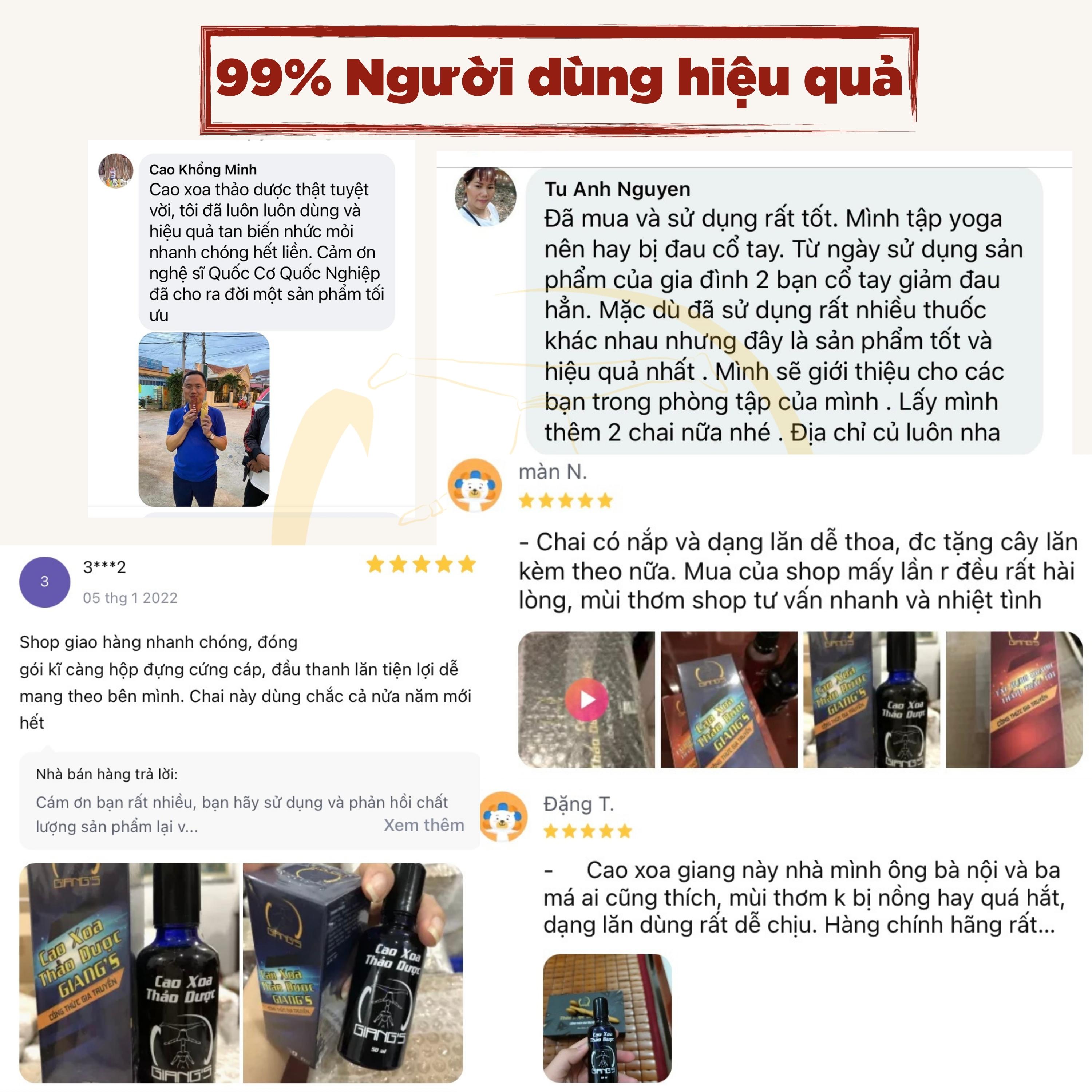 Mua tại TiktokCAO XOA BÓP THẢO DƯỢC GIANG'S GIẢM ĐAU CỔ-VAI-GÁY Công thức gia truyền qua nhiều thế hệ của gia đình Quốc Cơ - Quốc Nghiệp. Với thiết kế đầu bi lăn nhỏ dễ dàng thoa một lượng tinh chất vừa đủ lên chính xác các huyệt đạo giúp lưu thông khí huyết dễ dàng Thành phần thiên nhiên và không lưu hương nên rất thích hợp cho mọi loại da Thành phần chính: Carthamus Tinctorius (Safflower) Seed Oil (hồng Hoa), Cinnamomum Cassia Bark Essential Oil (Tinh Dầu Quế), Homalomena Occulta (Lour) Schott Essential Oil (Tinh Dầu Thiên Niên Kiện), Menthol (Tinh Dầu Bạc Hà), Methyl Salicylate (Dầu Nóng Salicylate), Ethanol (Cồn Thực Phẩm). Cam kết từ Giang's: Sản phẩm chính hãng của gia đình Quốc Cơ Quốc Nghiệp. Chiết xuất 100% Thảo dược thiên nhiên. Lưu ý khi sử dụng: Bi lăn Massage cho vùng Cổ - Vai - Gáy Không lăn trực tiếp vào vết thương hở. Tránh tiếp xúc trực tiếp với mắt. Luôn tuyển đại lý , cộng tác viên. BẢO QUẢN: Nơi khô mát NSX-HSD: In trên thân chai QUYỀN SỞ HỮU: Sản phẩm này của Công Ty TNHH Quốc Cơ Quốc Nghiệp
