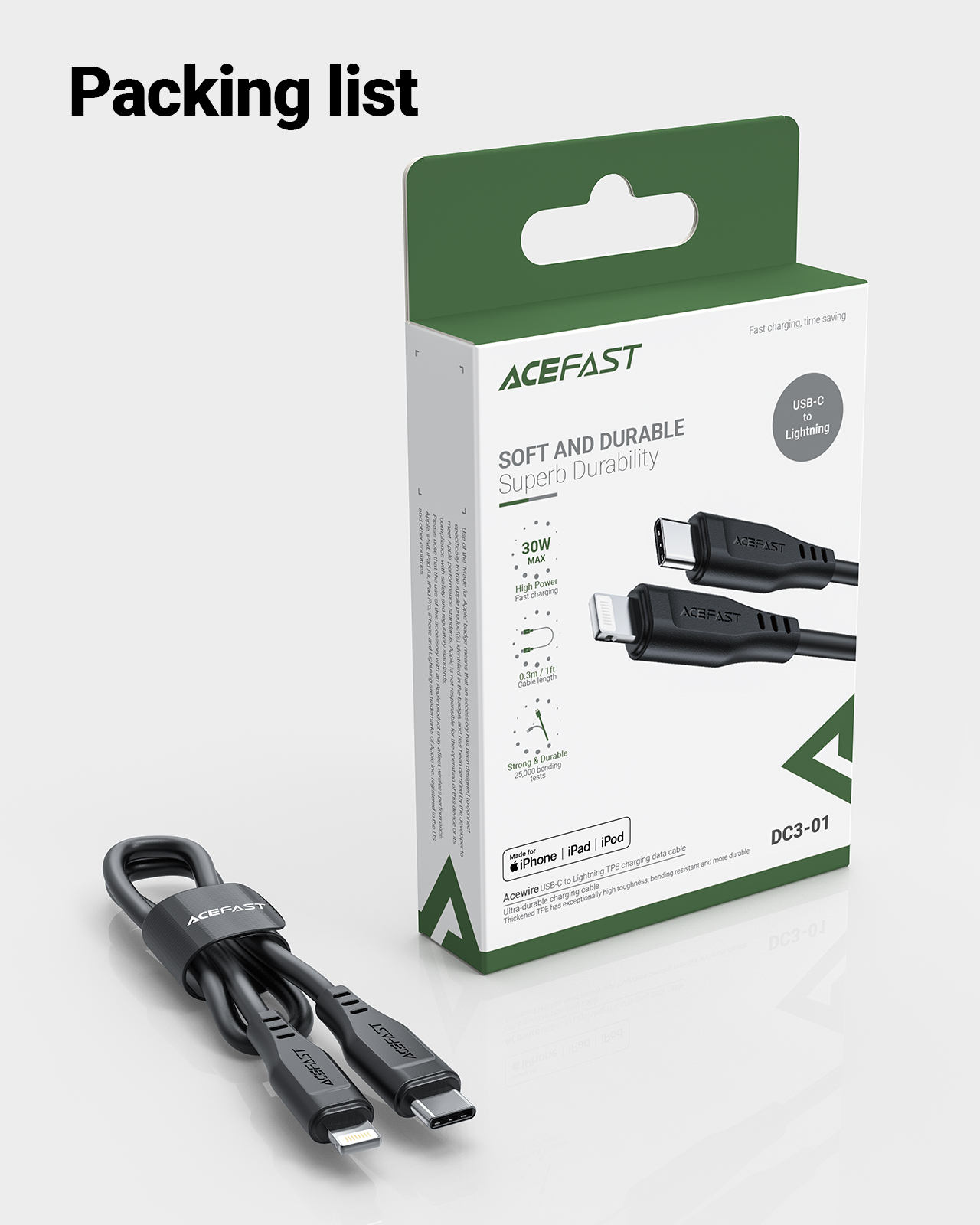 Cáp sạc iPhone 13 Series, iPad Pro 2017 ACEFAST DC3-01 USB-C ra Lightning MFi C94 PD 30W dài 0.3m
